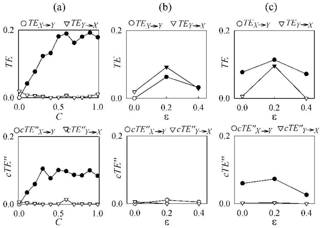 Results of transfer entropy analysis for the second simulation, showing the median values over 50 realizations of (7) and (8) of the TE (first panel row) and the compensated TE (second panel row) computed along the two directions of interactions (X→Y, circles; Y→X, triangles) (a) at varying the parameter C with parameter ε = 0; (b) at varying ε with C = 0 (b); and (c) varying ε with C = 0.2. Filled symbols denote statistically significant values of TE or cTE′′ assessed by means of the permutation test.