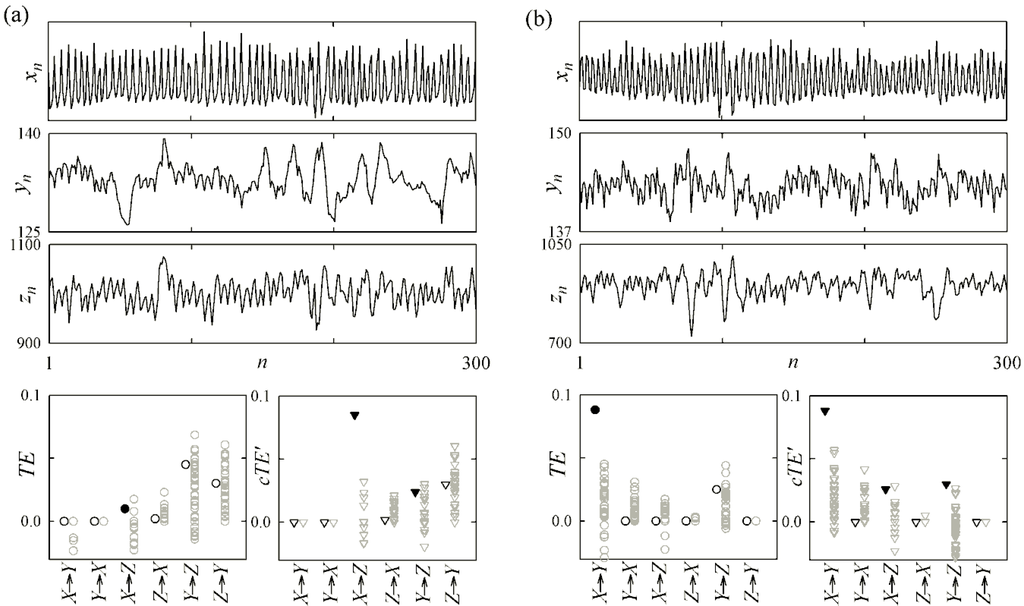 in this second case, the zero-lag term is considered as a conditioning factor (xn plays a similar role as y1:n-1 and z1:n), so that the present state of the source system is compensated to remove instantaneous causality from TE computation. The compensation performed in (5) is alternative to the test of time-shifted data recently proposed to detect instantaneous mixing between coupled processes []. Note that in both compensations in (4) and (5) instantaneous effects possibly occurring from any scalar element of Z towards Y are conditioned out considering the present term zn, in addition to the past terms z1:n-1, in the two CE computations; this is done to avoid that indirect effects x1:n-1→zn→yn were misinterpreted as the presence of predictive information transfer from the system X to the system Y. Note that, in the absence of instantaneous causality among the observed processes, the two cTE measures defined in (4) and (5) reduce to the traditional TE.