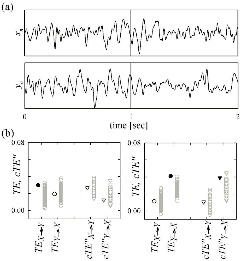 The analysis was performed on 100 realizations of (6), each lasting N = 300 points. For each realization, we computed the TE according to (3) and the cTE according to (4). The statistical significance of each estimated information transfer was assessed by using surrogate time series. Specifically, the TE or cTE of the original time series was compared with the distribution of its values obtained for a set of S = 40 realizations of time-shifted surrogates, obtained by shifting the source time series of a randomly selected lag (>20 points); then, the null hypothesis of absence of information transfer was rejected if the original TE or cTE took the first or second position in the descending ordered sequence of original and surrogate values (this corresponds to a type-I error probability of 0.0405 []).