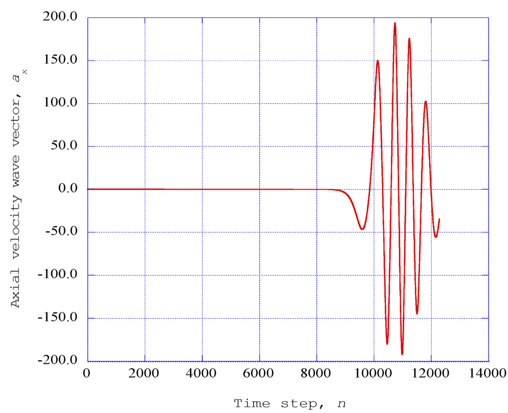 The axial velocity wave component ax from the modified Townsend equations is shown as a function of the time step, n. Parameters: Taft = 1140.0 K, PR = 10.0, x = 0.08, z = 0.003, j = 16 (η = 3.0).