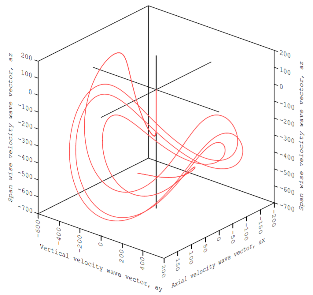The three-dimensional representation of the fluctuating velocity wave vector trajectories produced by the modified Lorenz system of equations is shown in