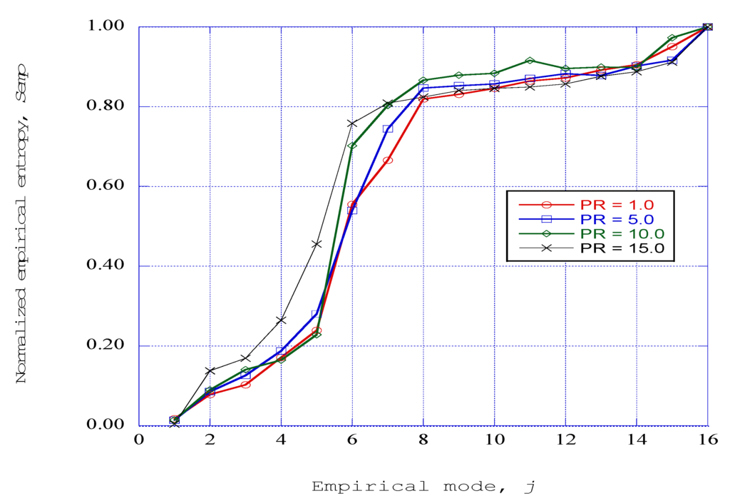 The effect of raising the channel pressure is to increase the empirical entropy in each of the respective empirical modes over the distribution of modes for the system. The four entropy regions shown for the initial pressure of PR = 1.0 also exist for the pressure ratios of PR = 5.0, 10.0, and 15.0.