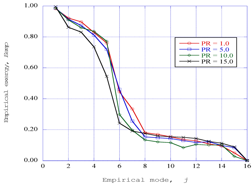 The effect of raising the channel pressure is to decrease the empirical exergy in each of the respective empirical modes over the distribution of modes for the system. However, the four exergy regions that exist for the initial pressure of PR = 1.0 also exist for the pressure ratios of PR = 5.0, 10.0, and 15.0.