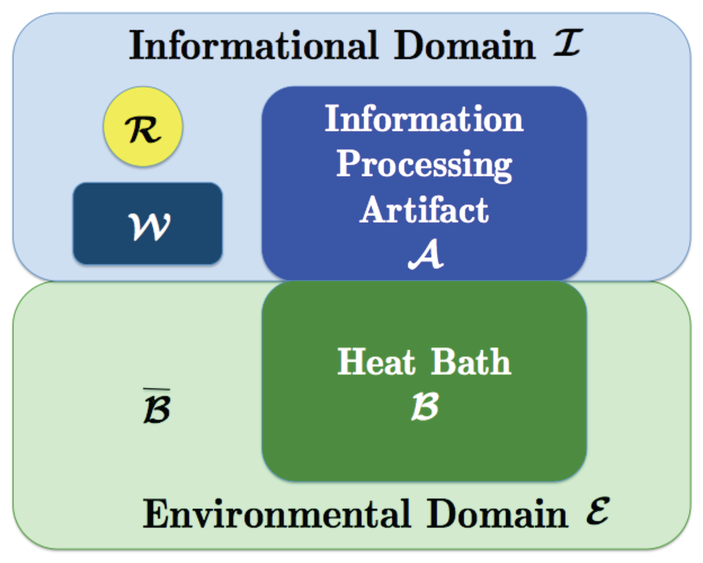 Generic multicomponent physical system, built around an information-processing artifact, , and heat bath , used here to obtain bounds on the dissipative costs of processing information about  in . The composite  is globally closed.