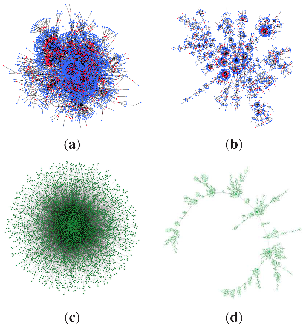 On Blogs (and Diggs), interactions among users are mediated by posts and comments-on-posts. Such indirect interactions are appropriately mapped onto [,] bipartite networks with directed and weighted links. Specifically, users, as one partition, are mutually separated via posts-and-comments, as the other partition, such that no direct link between the nodes of the same partition exists. Similar bipartite graphs are obtained in mapping the movie data []. In the considered data from digg.com, mapping the subset of data with discussion-driven posts, where comment-on-comment are in majority, (ddDiggs) [], we obtain the bipartite network which is shown in Figure 1a. In this network, users group around certain popular posts, while many other posts are gradually less commented. The grouping of users around popular posts leads to the formation of dense subgraphs, which are recognized as topological communities in the network [,,]. The presence of communities can be also seen by the branched structure of the maximum-flow spanning tree of the bipartite network. By definition, in this type of spanning tree, each node is connected to the remaining part of the tree by its strongest link. In the case of our bipartite graph, the strength of a link between a user-node and a post-node is determined by the number of comments of the user posted on that post. Considering the strength of the links in our bipartite network, but disregarding their directions, we obtain the maximum-flow spanning tree which is shown Figure 1b. The network flow among the nodes on the same branch is markedly larger compared with the flow between the branches (different branches roughly correspond to the weighted communities on the network).