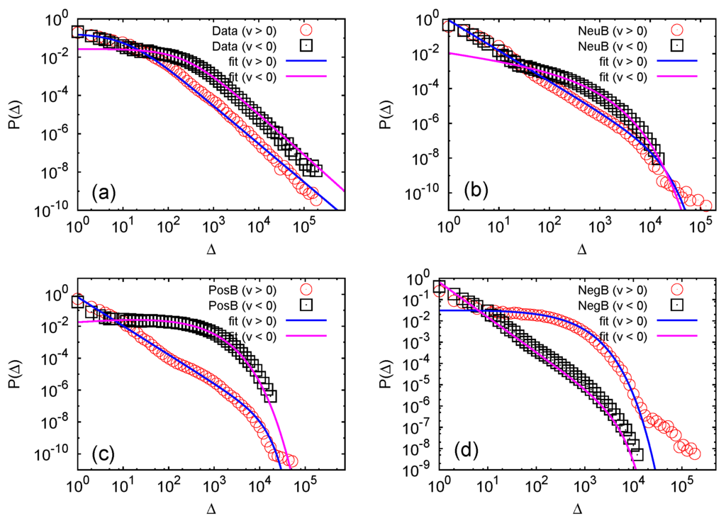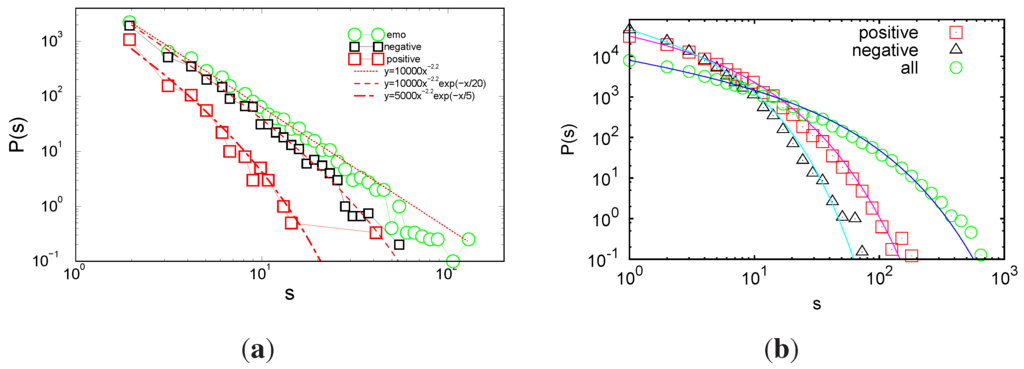 Apart from the emergence of networks with emotion carrying links, the collective emotional behavior of users has been studied quantitatively by means of time series analysis and statistics of avalanches. The time series of messages carrying positive/negative emotion valence is constructed by selecting the number of such messages occurring within a small time bin. The avalanche (burst) of emotional messages is then identified as temporally connected sequence of events occurring above a threshold line (noise level) along the respective time series [,,]. In Figure 2 the distributions of sizes of such avalanches are shown, determined from the empirical data of BBCblog and Ubuntu chats.
