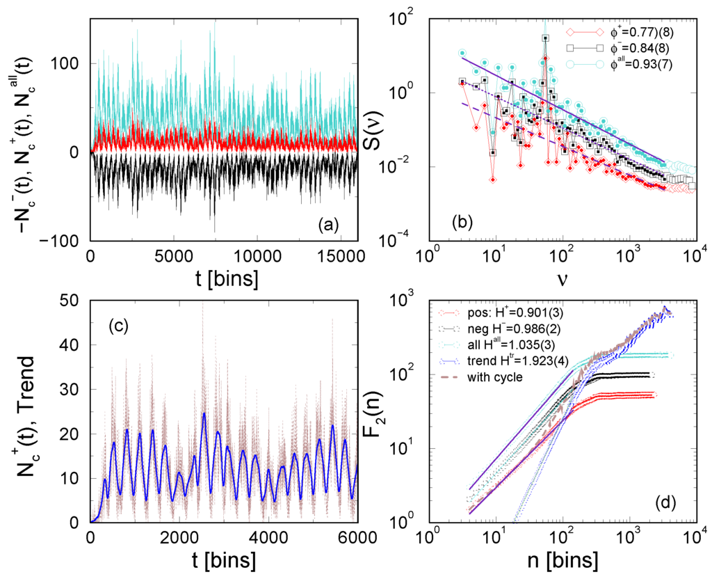 In ddDiggs, large activity of users leads to strong fluctuations in the number of messages per time bin ( 5 min). Moreover, these time series exhibit strong daily fluctuations, related with the circadian cycles of users. The number of negative emotion messages, plotted with the negative sign to avoid overlap, exceeds the number of positive emotion messages, cf. Figure 3a. The fractal structures of these time series also differ in the quantitative measures: power spectral densities and Hurst exponents. Specifically, the power spectrum, shown in Figure 3b, exhibits a strong peak, corresponding to daily cycle, however, the remaining spectrum obeys a power-law decay as ; the respective numerical values of the exponents (indicated on the figure) are characteristic for the stochastic point processes []. The exponents ϕ corresponding to the power spectrum of all messages time series and time series with negative emotion messages are approaching the limit of flicker noise. Whereas, somewhat weaker correlations are found in the case of positive emotion messages.