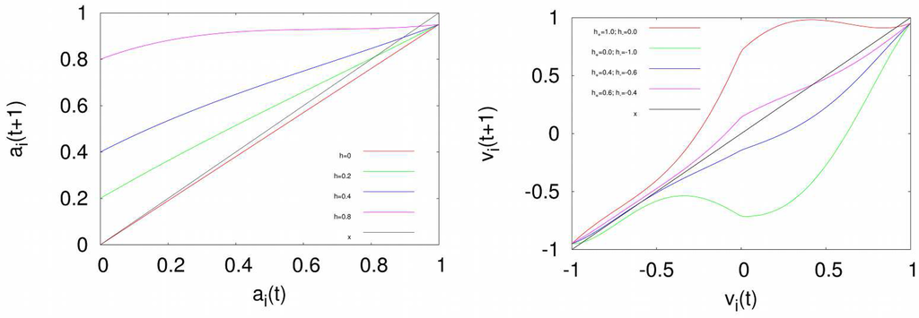 - Building influence. Agent’s activity—posting a new post or comment on an existing post—can influence emotional states of other agents who are linked to that post. The influence field for a particular agent i builds from all posts and/or comments posted within previous and current time step, to which the agent has a link . The arousal field is composed from the arousals of related comments, i.e.,Here, the network area of currently active posts is identified as post on which an activity occurred in two preceding time steps. and are the total arousal and the average valence of a post p, calculated from the comments in two preceding time steps, while is the number of all comments posted on it during that time period. represents the matrix elements of the network, i.e., if user i is connected with the active post p, while if there is no link between them at the time t when the fields are computed. Note that such links may appear as the system evolves. In Equation (2) the individual arousal fields is modified by (dis)similarity in agent’s actual valence, , and the valence of recent comments on the post, . The common field affects each active agent equally; it is given as a sum of arousals of all active posts. The valence field in Equation (6) acting on the agent i, as well as the corresponding common field , are also determined from the contributions of all active posts at time t. In this case, however, we take into account contributions from the positive and the negative comments separately; the neutral comments do not contribute to the valence field. Depending on the current emotional state of the agent, positive and negative fields can lead to different effects [], in particular, positive (negative) state will be influenced more with negative (positive) field, and vice versa. Here we assume that both components influence user valence, but with different strength according to the following expression:where the valence polarity of the user i is given by , and is the number of positive/negative comments written on post p in the period . The normalization factor is defined as . Note that, in the absence of psychology-based arguments, the pre-factor 0.4 is chosen by formal reasons, i.e., to avoid a fast switching of the valence polarity (in the limiting cases: 0 or 1) as well as an artificial reduction of the phase space (if the value 0.5 is used). The mean-field contributions to the valence stem from the entire set of currently active posts , and are independent on how users are linked to them:However, the mean-field effects are perceived individually by each agent, depending on the polarity of agent’s current valence.