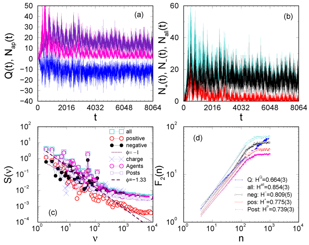 Performing a similar analysis for the time series of messages from the empirical data of Ubuntu chats, we obtain the results which are displayed in Figure 4a–d. The obtained quantitative measures, however, indicate that we are dealing with a different stochastic point process. Here, the number of positive and the number of negative emotion messages are approximately balanced (see Figure 4a). Consequently the time series of positive and negative emotional messages fluctuate within similar ranges, and their power spectral densities have comparable slopes, i.e., , , and . Moreover, no prominent daily cycle is found. A weak seven days cycle can be determined (depicted in Figure 4c). Consequently, in the detrended time series an extended scaling region of the fluctuations is found, as shown in Figure 4d. The numerical values of the Hurst exponents are smaller, compared with the ones in ddDiggs; However, for all time series the Hurst exponents are in the range , indicating that the persistent fluctuations also occur in the dynamics of chats. Further understanding of the stochastic processes in online chats and Blogs and mechanisms underlying clustering of emotional messages are studied below within agent-based modeling approach. (See also []).