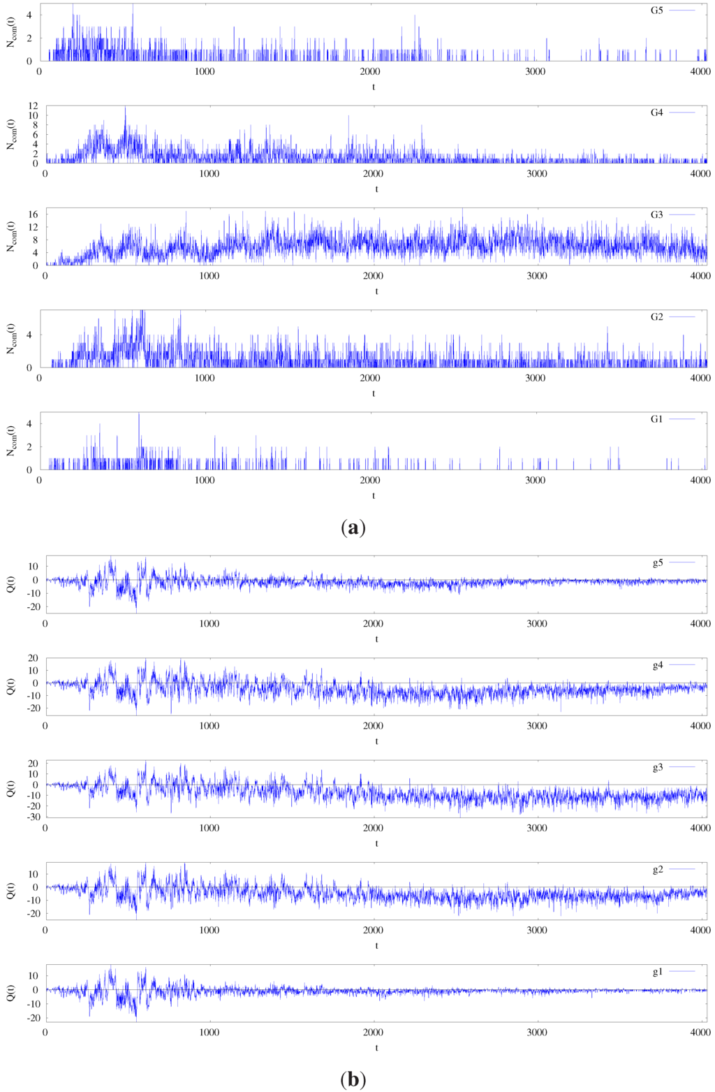 - Driving. Starting with an empty system, at each time step t we add new agents; these agents become immediately active, thus potentially triggering the action of other agents in future steps. Chosing as the empirical time series of new users (with respect to the beginning of the dataset), has the following advantages. Firstly, the empirical time series introduces the daily cycles, characteristic for human activity. The time series from ddDiggs dataset is given in Figure 5b. Secondly, the time bin of the empirical time series sets the physical meaning of time step in the simulations; therefore, this allows a comparison of the simulated and the empirical system as well as predictions of potential future events.