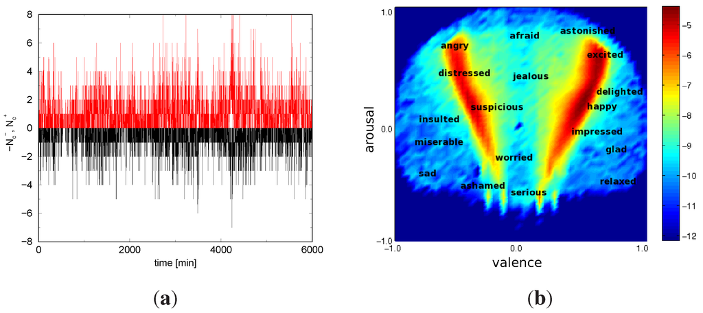 Communications between users on different Web portals provides a wealth of data, which contains rich information about human dynamics online. Recently, intensive research based on these empirical data, seen as examples of complex dynamical systems in the physics laboratory, has been performed: this research contributed to quantitative study of social phenomena on Blogs [,], Diggs [], Forums [], online games [,], online social networks MySpace [], Facebook [], Twitter [], online chats [] and other online communication systems. By using different machine-learning methods of text analysis (a recent review of methods can be found in []), one can infer contents that are communicated in the text messages exchanged between users. For example, concepts as units of information carried by the message can be inferred by suitable algorithms []. Furthermore, by lexicon-based methods [,] more components of emotion can be measured, i.e., by coordinating the emotional words in the text of a message with their values in the lexicon of affective words. In this way, an emotion [] as it is known in common life can be identified. According to Russel’s circumplex model of emotion [], different emotions are distributed in a two-dimensional circular space, representing two emotion components—arousal (degree of reactivity) and valence (intrinsic attractiveness or aversiveness of an object, event or situation). Thus, a neutral valence and a medium arousal correspond to the emotion at the center of the circle. The empirical data about user communications, enriched by these additional attributes, make a good source for research into the role of emotion and information in online social dynamics.