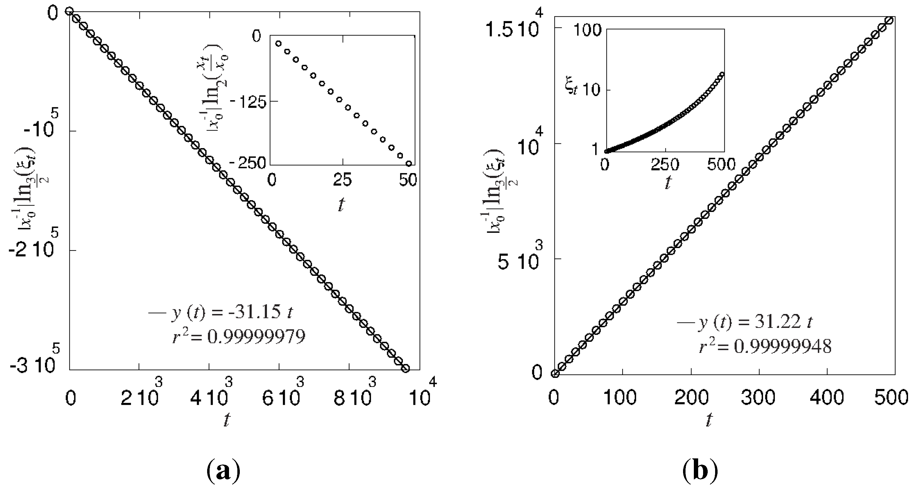 and so, and [3,4]. When the left-hand side () of the tangent bifurcation map, Equation (9) exhibits a weak insensitivity to initial conditions, i.e., power-law convergence of orbits. However at the right-hand side () of the bifurcation, the argument of the q-exponential becomes positive, and this results in a “super-strong” sensitivity to initial conditions, i.e., a sensitivity that grows faster than exponential [3]. For the tangent bifurcation, one has in , and so, . For the pitchfork bifurcation, one has in , and one obtains . Notably, these specific results for the index q are valid for all and, therefore, define the existence of only two universality classes for unimodal maps, one for the tangent and the other one for the pitchfork bifurcations [3]. See Figure 1 and Figure 2 for numerical corroboration of the following. In Figure 1a, the full line is a linear regression, whose slope, , should be compared with the exact expression for the generalized Lyapunov exponent, which gives Inset: , for and . A linear regression gives, in this case, a slope of , to be compared with the exact result ; In Figure 1b the full line is a linear regression with a slope equal to . Inset: Log-linear plot of evidencing a super-exponential growth. In Figure 2 the full line is a linear regression, whose slope, , should be compared with the analytical expression for the generalized Lyapunov exponent, which gives Inset: , for and . A linear regression gives, in this case, a slope of , to be compared with the analytical result .