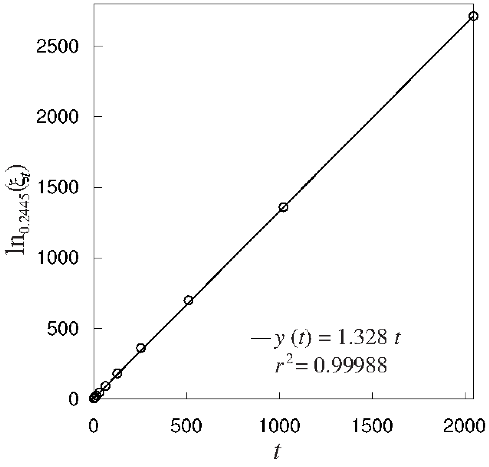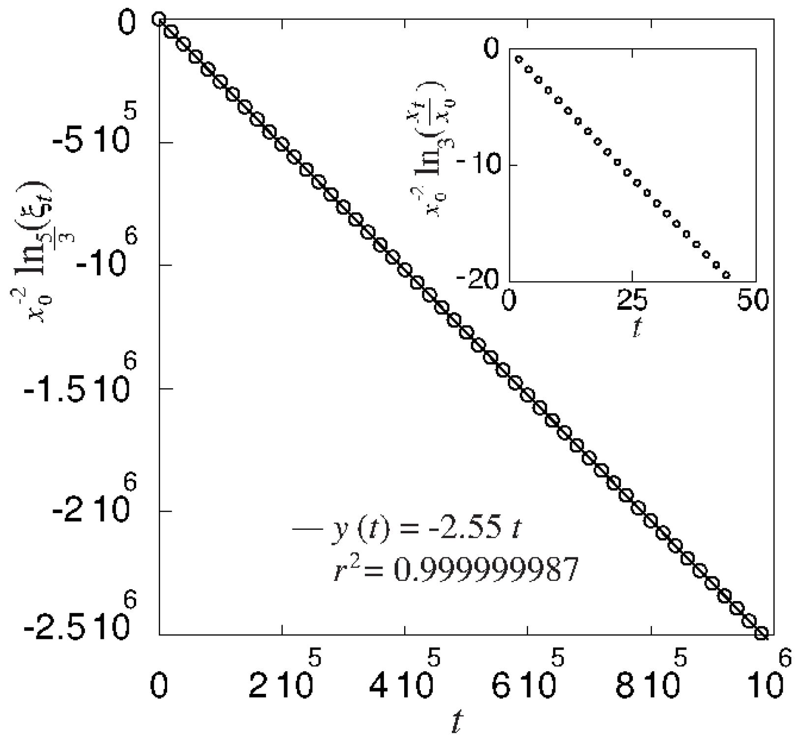 The q-logarithm of sensitivity to initial conditions vs. t, with and initial conditions and (circles). The full line is the linear regression, . As required, the numerical results reproduce a straight line with a slope very close to