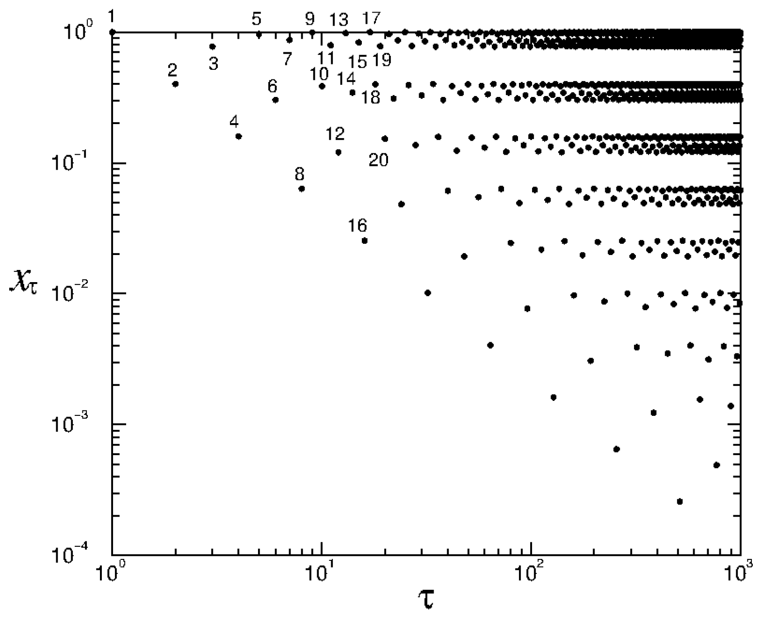 Absolute values of positions in logarithmic scales of the first 1000 iterations τ for a trajectory of the logistic map at the onset of chaos with initial condition . The numbers correspond to iteration times. The power-law decay of the time subsequences described in the text can be clearly appreciated.