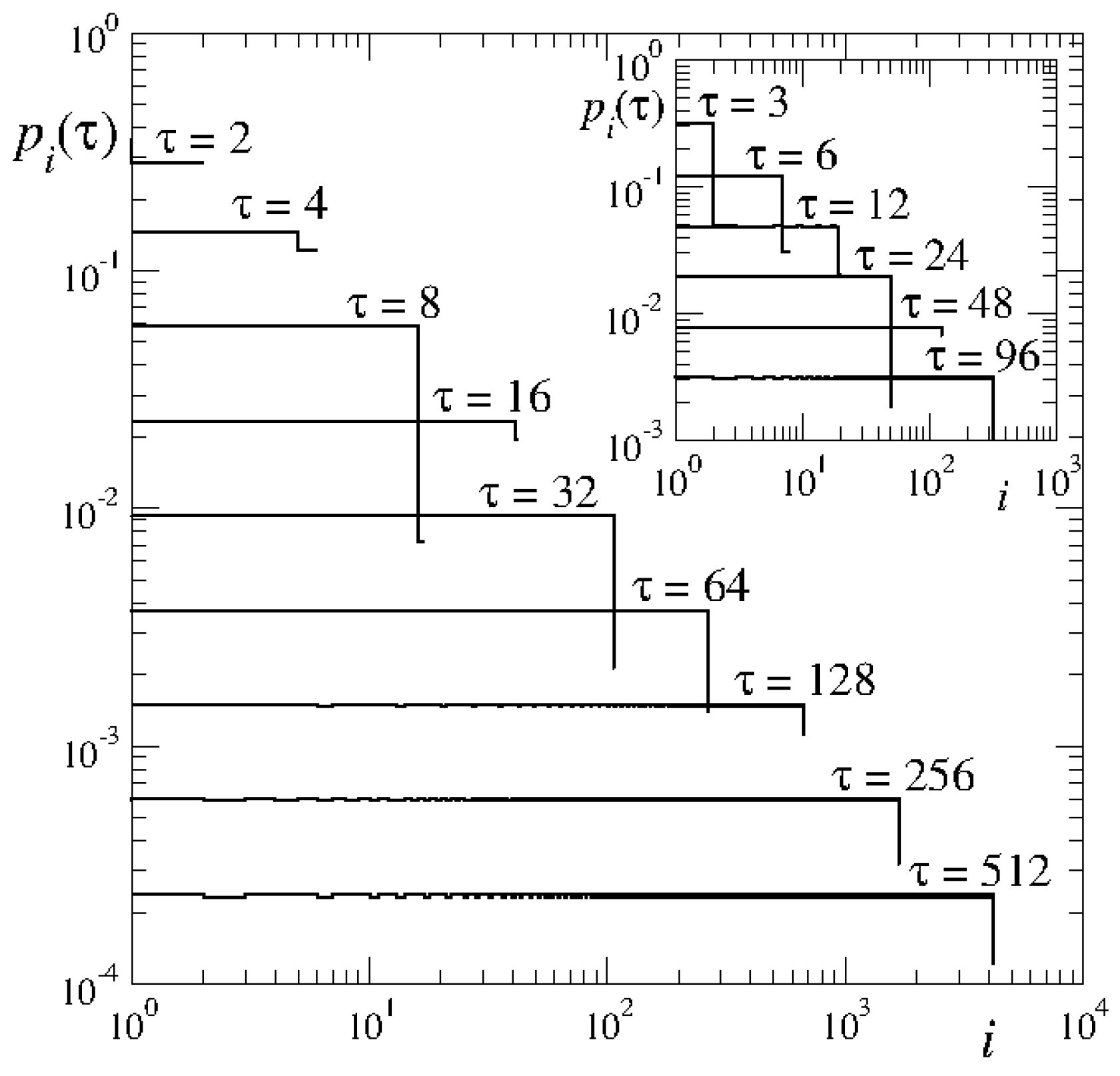 Time evolution, in logarithmic scales, of a distribution, , of trajectories at . Initial positions are contained within a cell adjacent to , and i is the relative number of cells. Iteration time is shown for the first two subsequences ().
