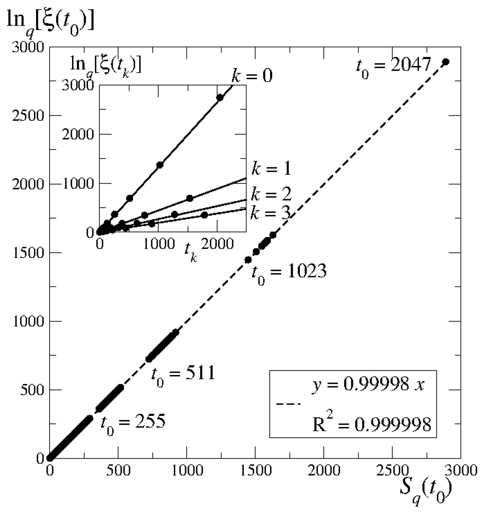 Numerical corroboration (full circles) of the generalized Pesin identity at . On the vertical axis, we plot the q-logarithm of (equal to and in the horizontal axis (equal to ). In both cases, The dashed line is a linear fit. In the inset, the full lines are from analytical results.
