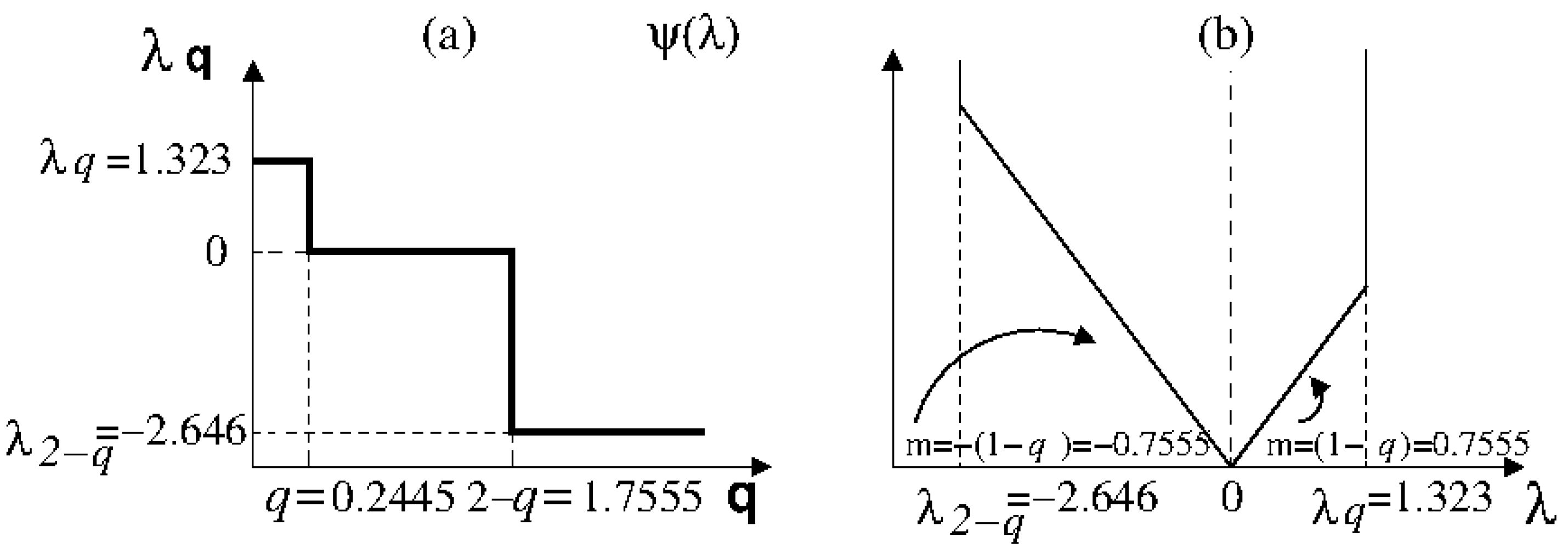 where q and the spectra, and , depend on the parameters that describe the discontinuity [4]. This result reflects the multi-region nature of the multifractal attractor and the memory retention of these regions in the dynamics. The pair of q -exponentials correspond to a departing position in one region and arrival at a different region and vice versa; the trajectories expand in one sense and contract in the other. The largest discontinuity of at is associated with trajectories that start and finish at the most crowded () and the most sparse () regions of the attractor. In this case, one obtains, again, Equation (15), the positive branch of the Lyapunov spectrum, when the trajectories start at and finish at . By inverting the situation, one obtains Equation (16), the negative branch of the Lyapunov spectrum. Therefore, when considering these two dominant families of orbits, all the q-Lyapunov coefficients appear associated with only two specific values of the Tsallis index, q and , with q given by Equation (13).