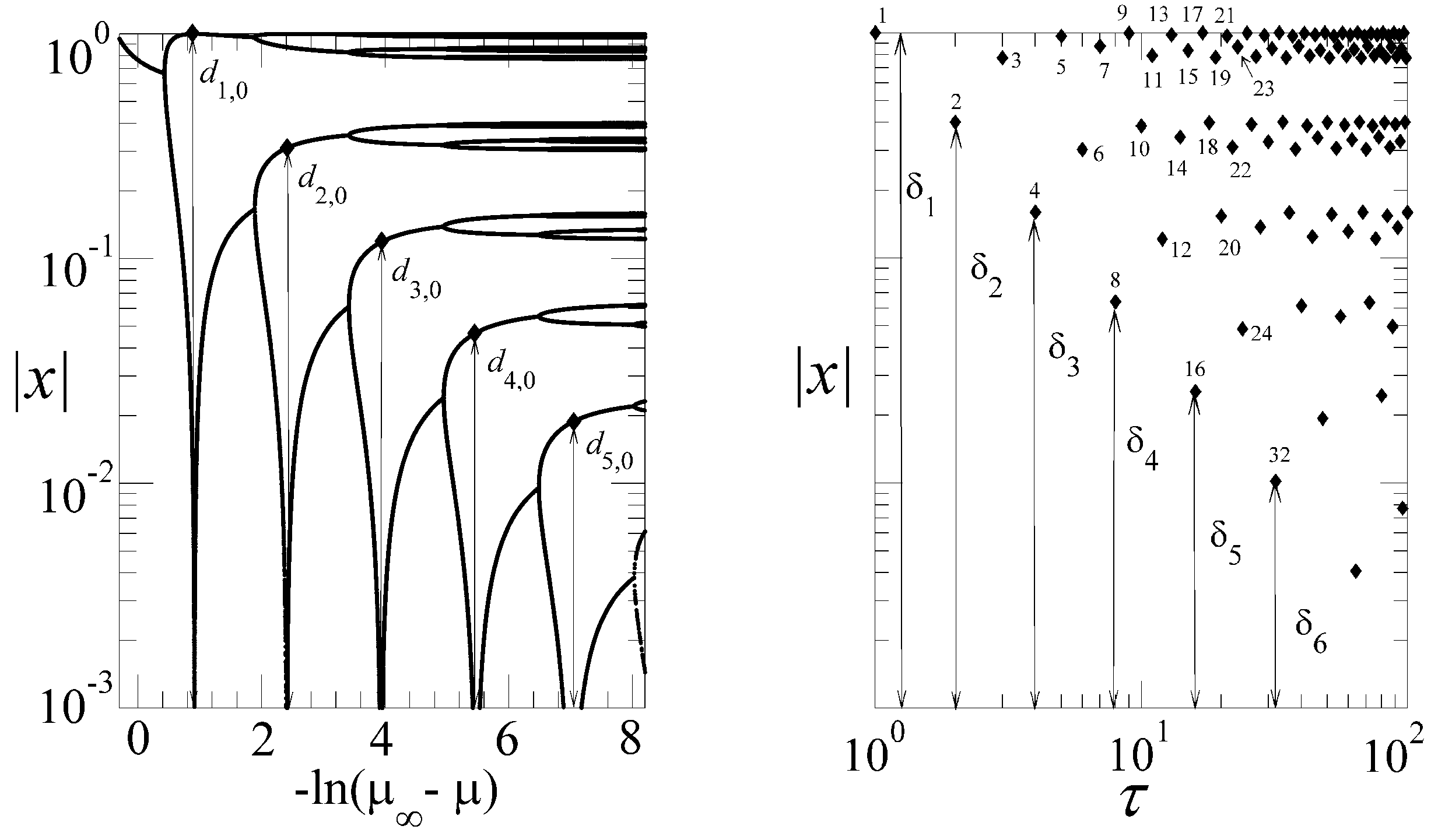 (Left panel) Absolute value of attractor positions for the logistic map, , in logarithmic scale, as a function of . (Right panel) Absolute value of trajectory positions for at with initial condition in logarithmic scale, as a function of the logarithm of time τ; τ is also shown by the numbers close to the diamonds. The arrows indicate the equivalence between the diameters in the left panel and position differences with respect to in the right panel.