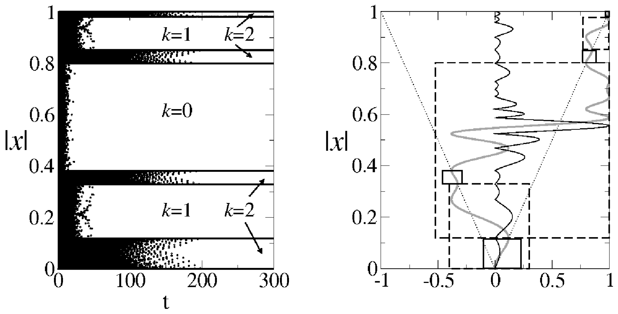 Phase-space gap formation for . (Left panel) Time evolution of a uniform ensemble of trajectories as a function of (black areas and open circles). The values of the index k label the order of the gap set. (Right panel) Rotated plots of and as guides for the identification of attractor and repellor positions.