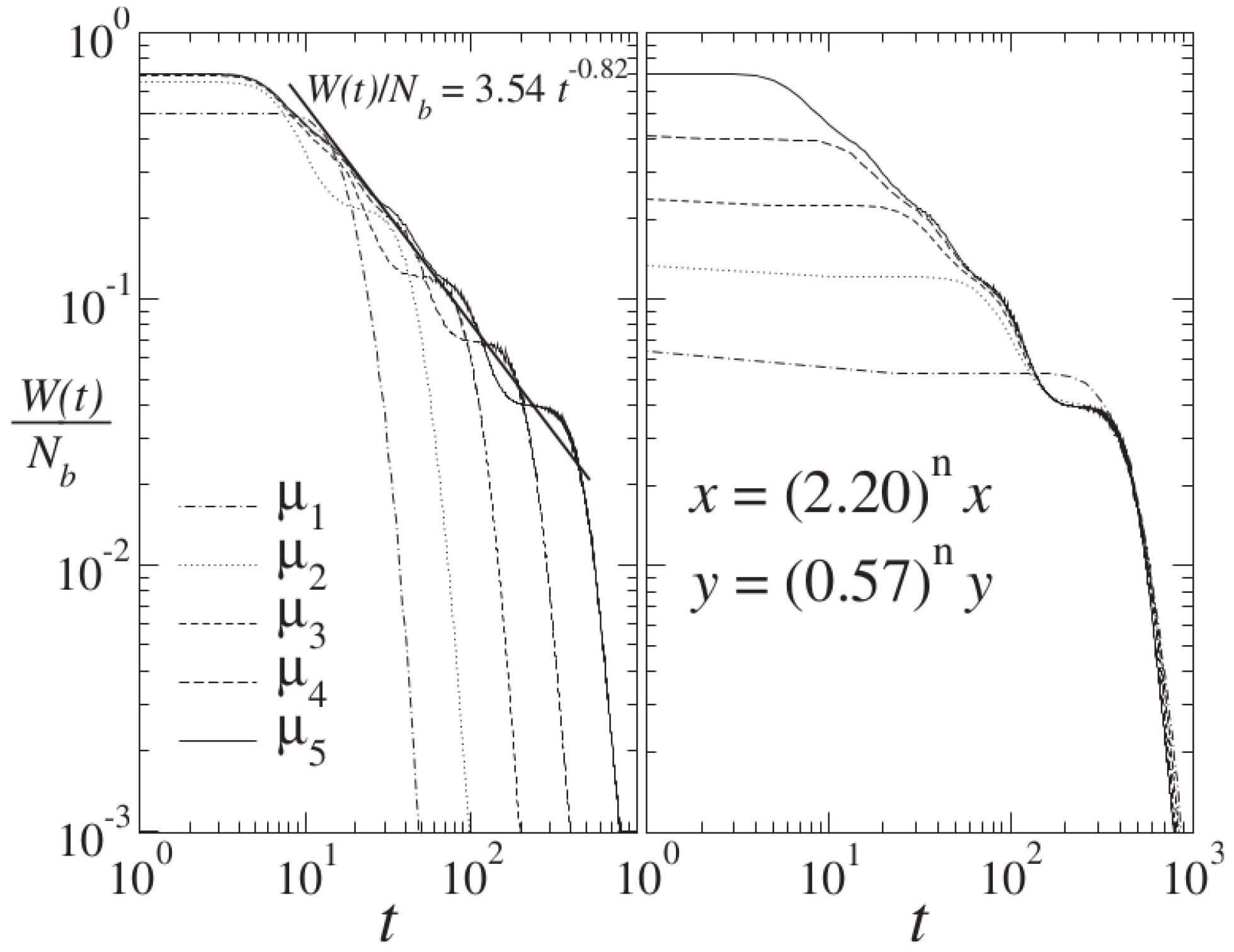 (Left panel) Rate , divided by the number of boxes, , employed, of an approach to the attractor for the supercycles of periods and 5 on logarithmic scales. The expression shown corresponds to the power law decay of the developing logarithmic oscillations. Right panel: Superposition of the five curves for in the left panel via n-times repeated rescaling factors shown for the horizontal x and vertical y axes.