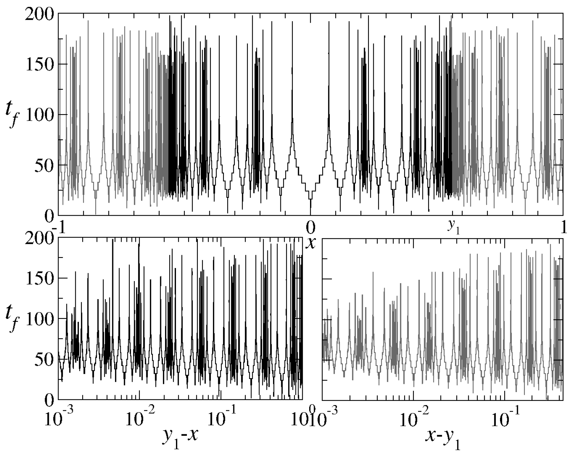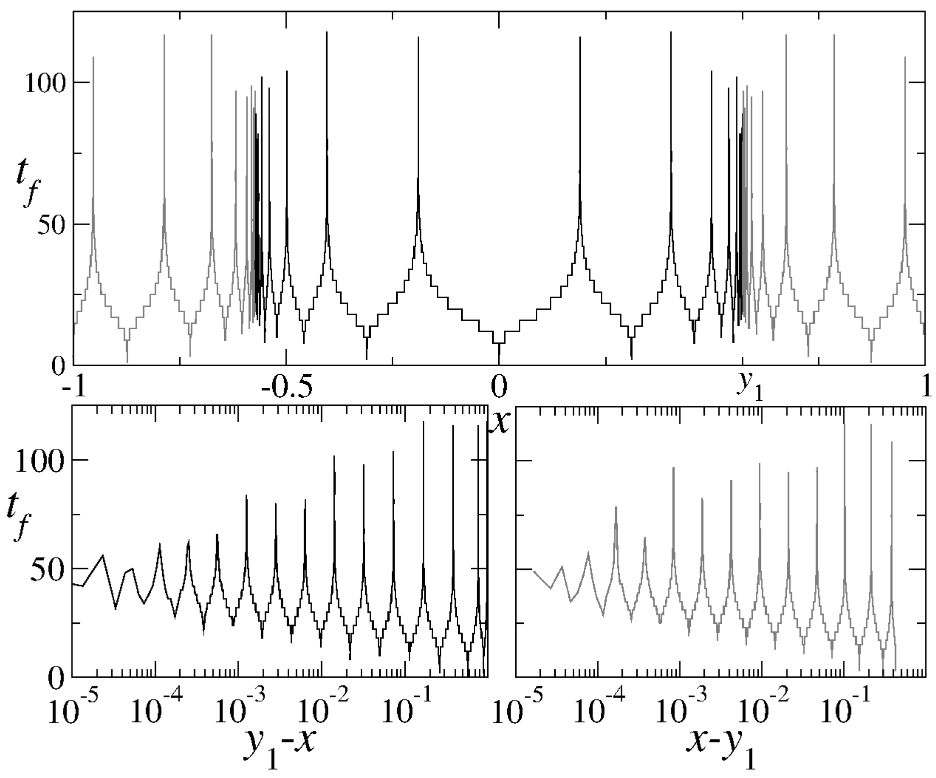 (Top panel) Time of flight for ; the black lines correspond to initial conditions that terminate at the attractor positions and and the gray lines to trajectories ending at and . (Right (left) bottom panel) Same as the top panel, but plotted against the logarithm of . It is evident that the peaks are arranged exponentially around the old repellor position, , i.e., they appear equidistant on a logarithmic scale.