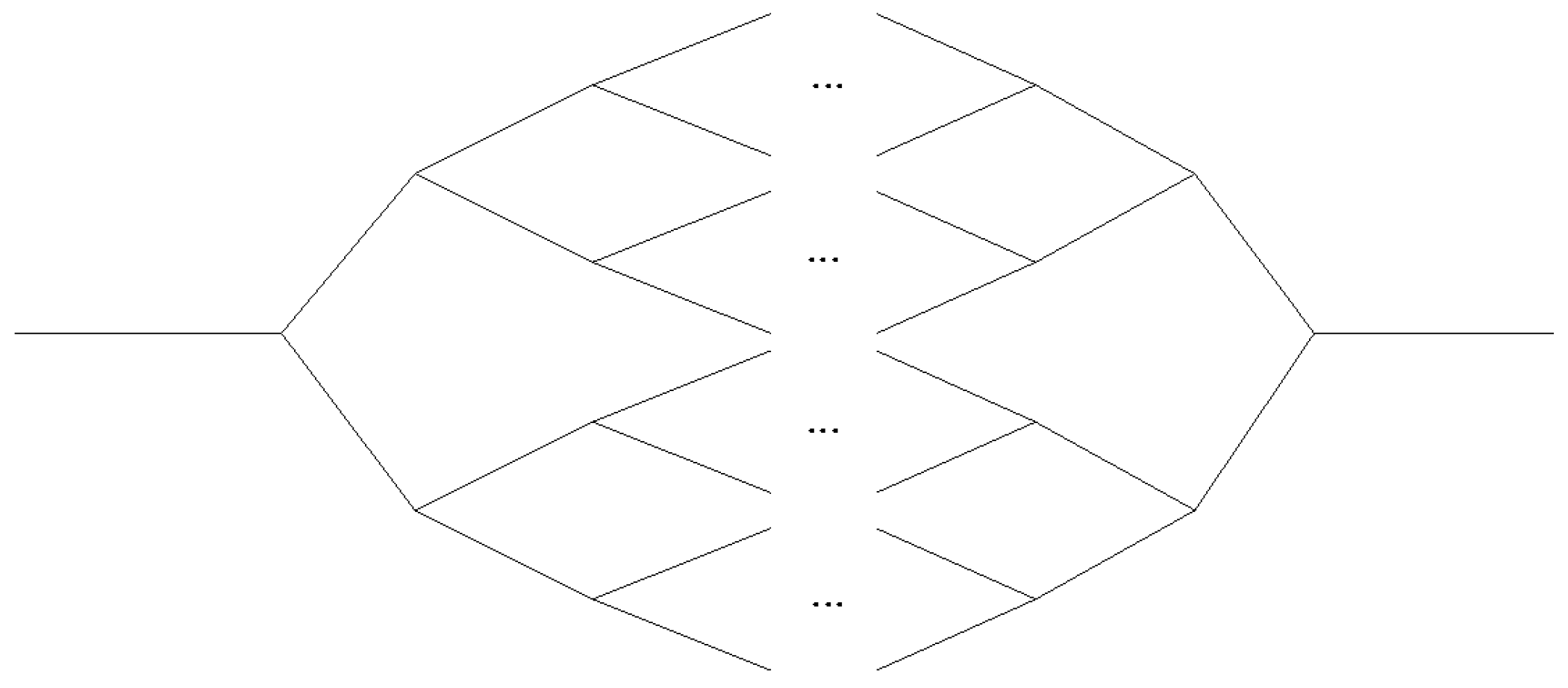 To complete our argument, we remember the persistency property of trajectory distributions of unimodal maps at the period-doubling onset of chaos. That is, for a small interval of length with uniformly-distributed initial conditions around the extremum of a unimodal map, all trajectories behave similarly, remain uniformly-distributed at later times and follow the concerted pattern shown in the left panel of Figure 26. As we described above (see Subsection 2.3 and Figure 5) at the period-doubling transition to chaos, it was found that if the initial distribution is uniform and defined around a small interval of an attractor position, the distribution remains uniform for an extended period of time, due to the subexponential dynamics. We denote this distribution by , where and is the length of the interval that contains the trajectories at time t. All such trajectories give rise to the same Feigenbaum graph [25], and at iteration times, say, of the form , , the HV criterion assigns links to the common node . While π is defined in the map, we inquire about the j-dependence of .