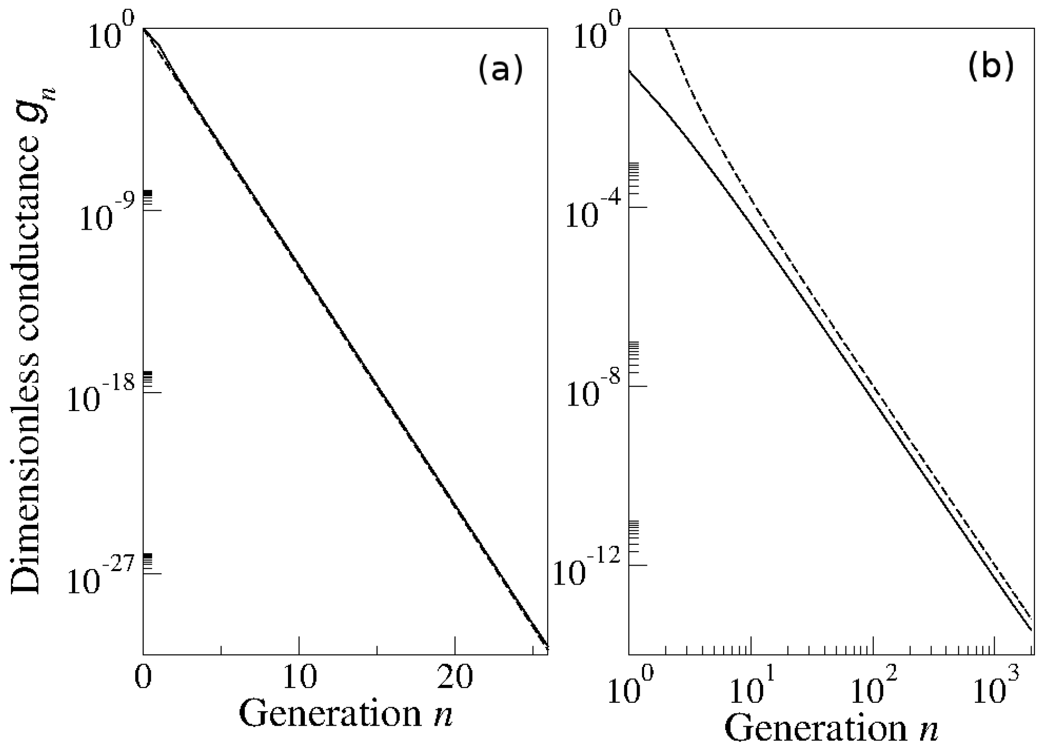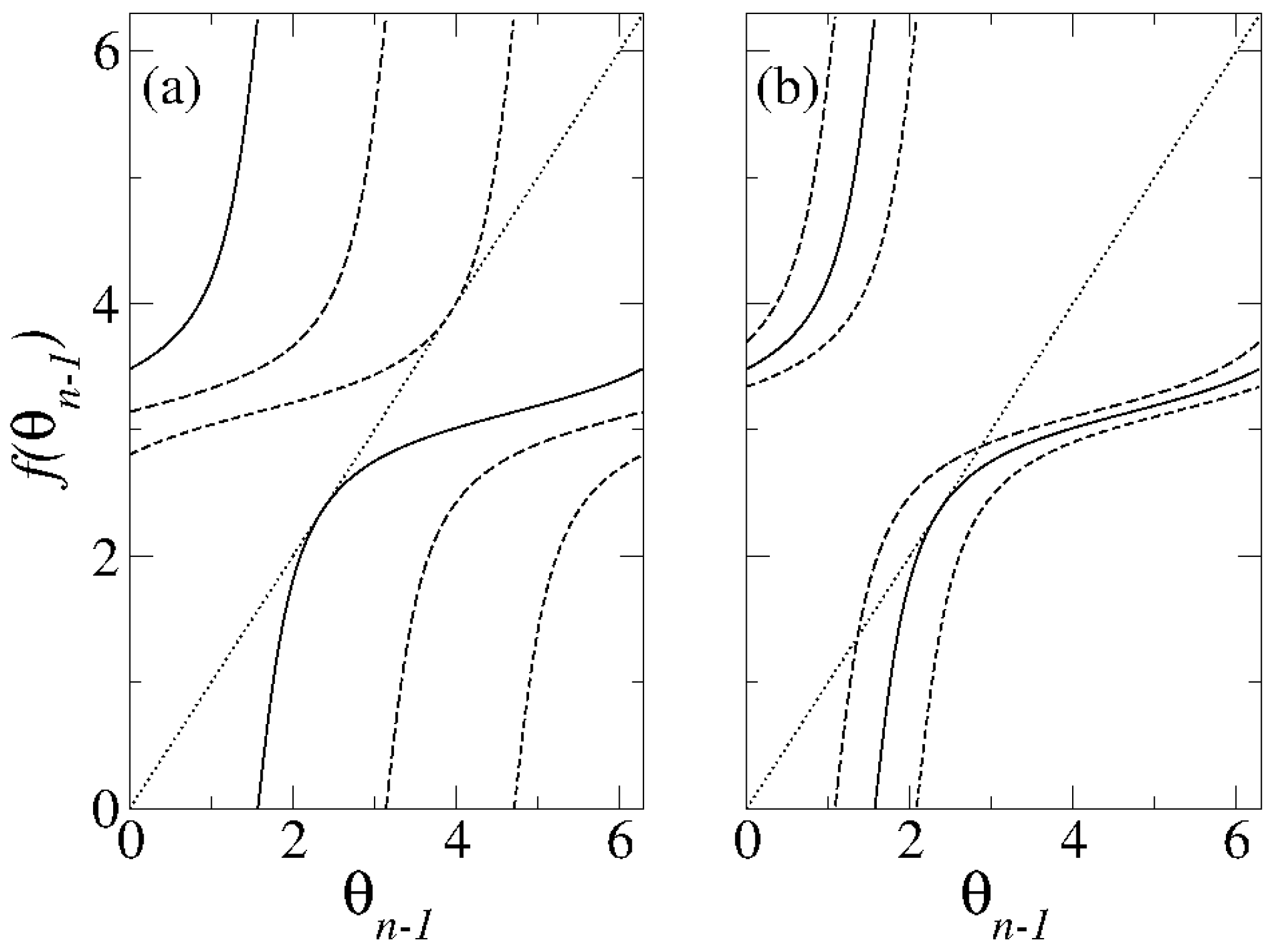 Numerical corroboration of Equation (11) for the tangent bifurcation. Panel (a) corresponds to the left side of the first tangent bifurcation for . Circles represent for the iterates of and . Panel (b) corresponds to the right side of the first tangent bifurcation for . Circles represent for the iterates of and . See text for description.