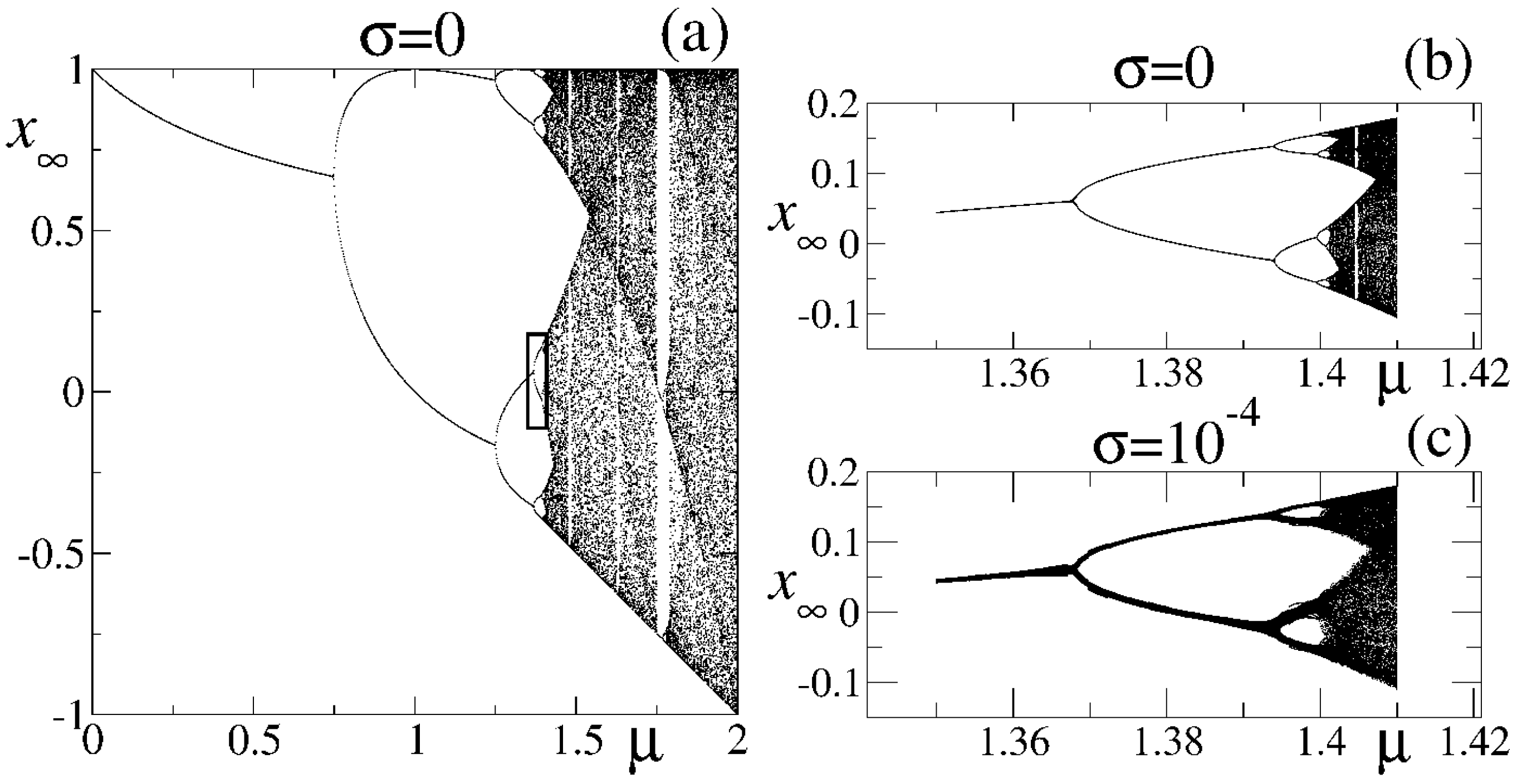 A unimodal map (a one-dimensional map with one extremum) contains infinite families of critical attractors with vanishing Lyapunov exponent at which the ergodic and mixing properties breakdown [26]. These are the tangent bifurcations that give rise to windows of periodic trajectories within chaotic bands and the accumulation point(s) of the pitchfork bifurcations, the so-called period-doubling onset of chaos [8,9] at which these periodic windows come to an end. There are other attractors for which the Lyapunov exponent, , diverges to minus infinity, where there is faster than exponential convergence of orbits. These are the superstable attractors located between successive pitchfork bifurcations. They are present at the initial period-doubling cascade and at all the other cascades within periodic windows with accumulation points that are replicas of the Feigenbaum attractor.