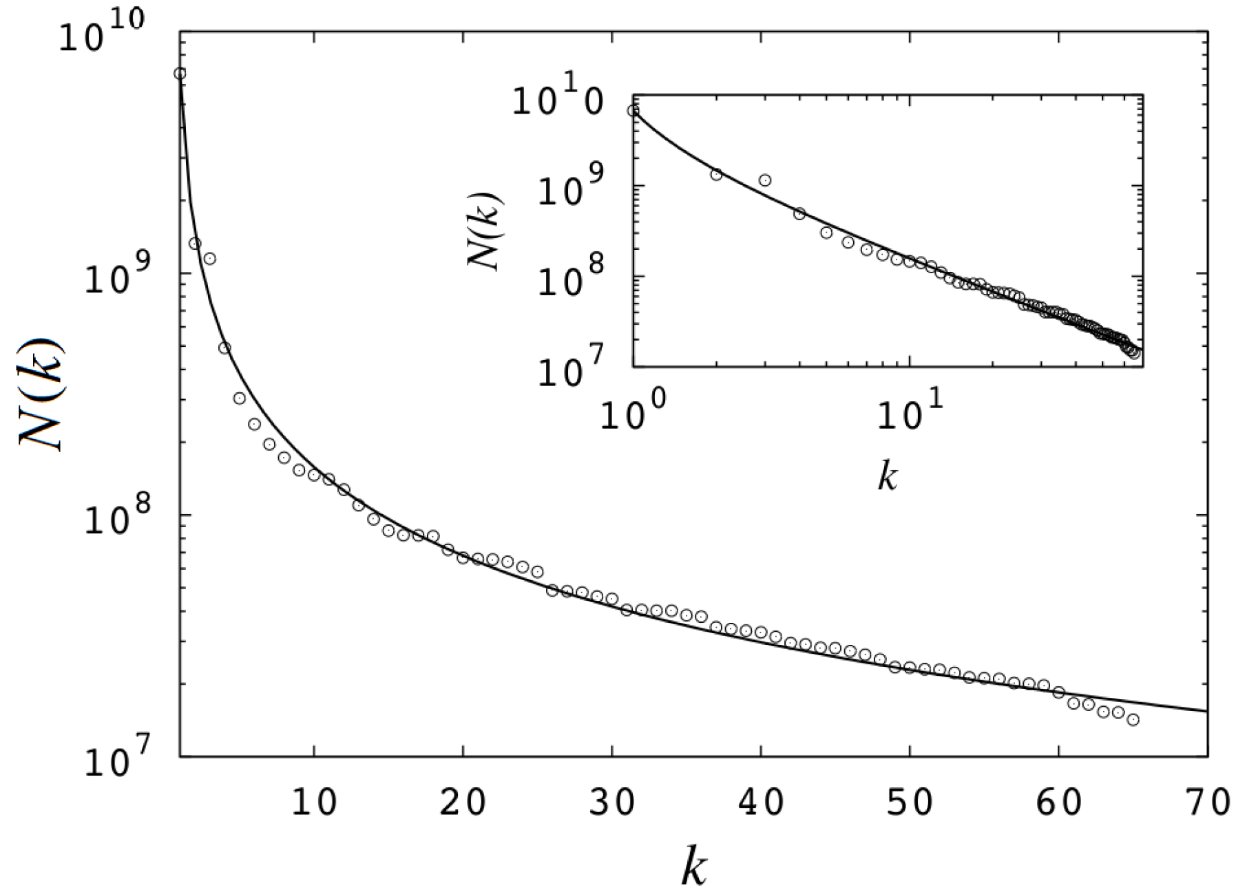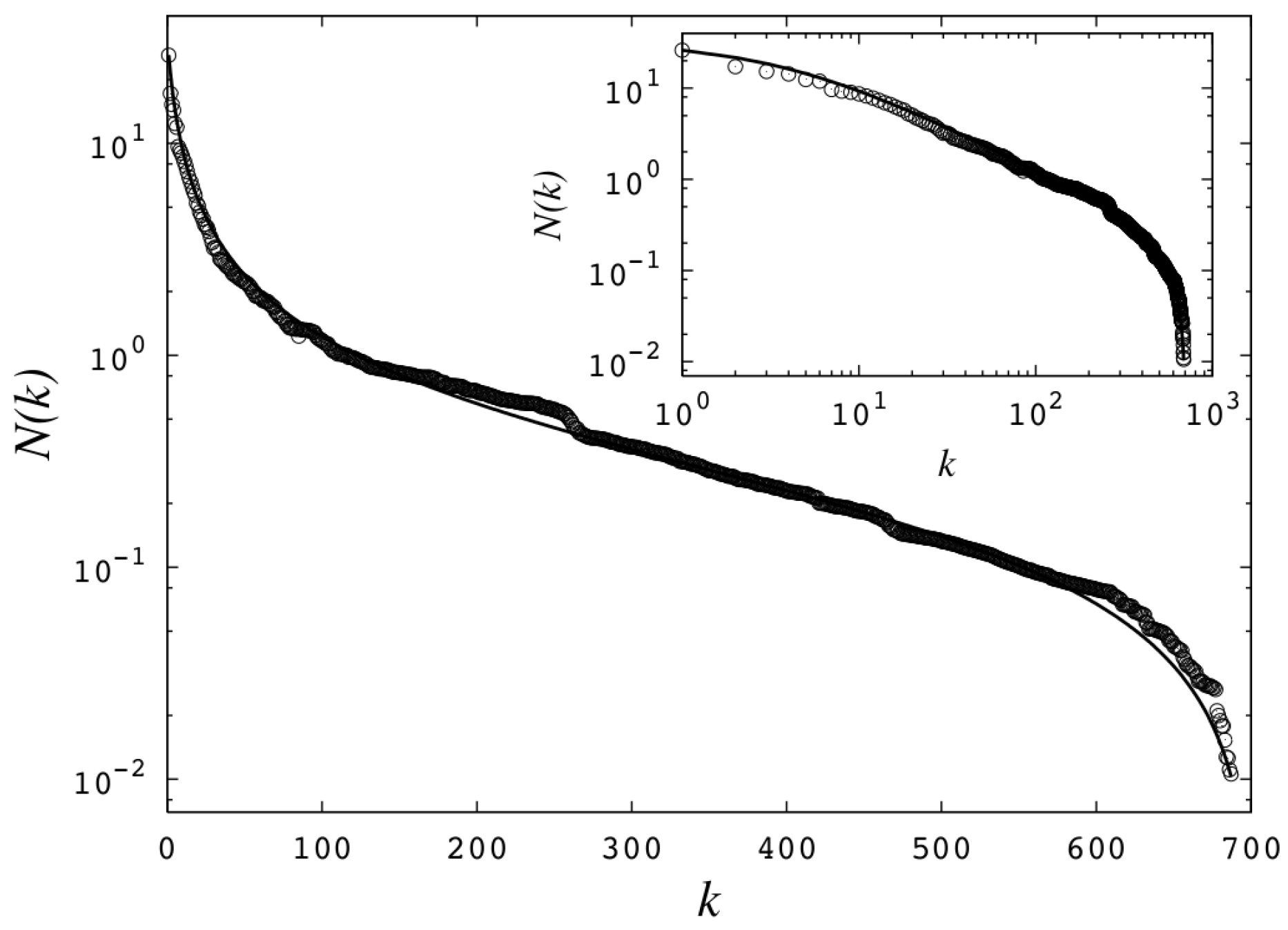 Size-rank statistics for the eigenfactor of physics journals. Equation (42) with the identifications provided in the text when and (smooth curve) is fitted to the data.