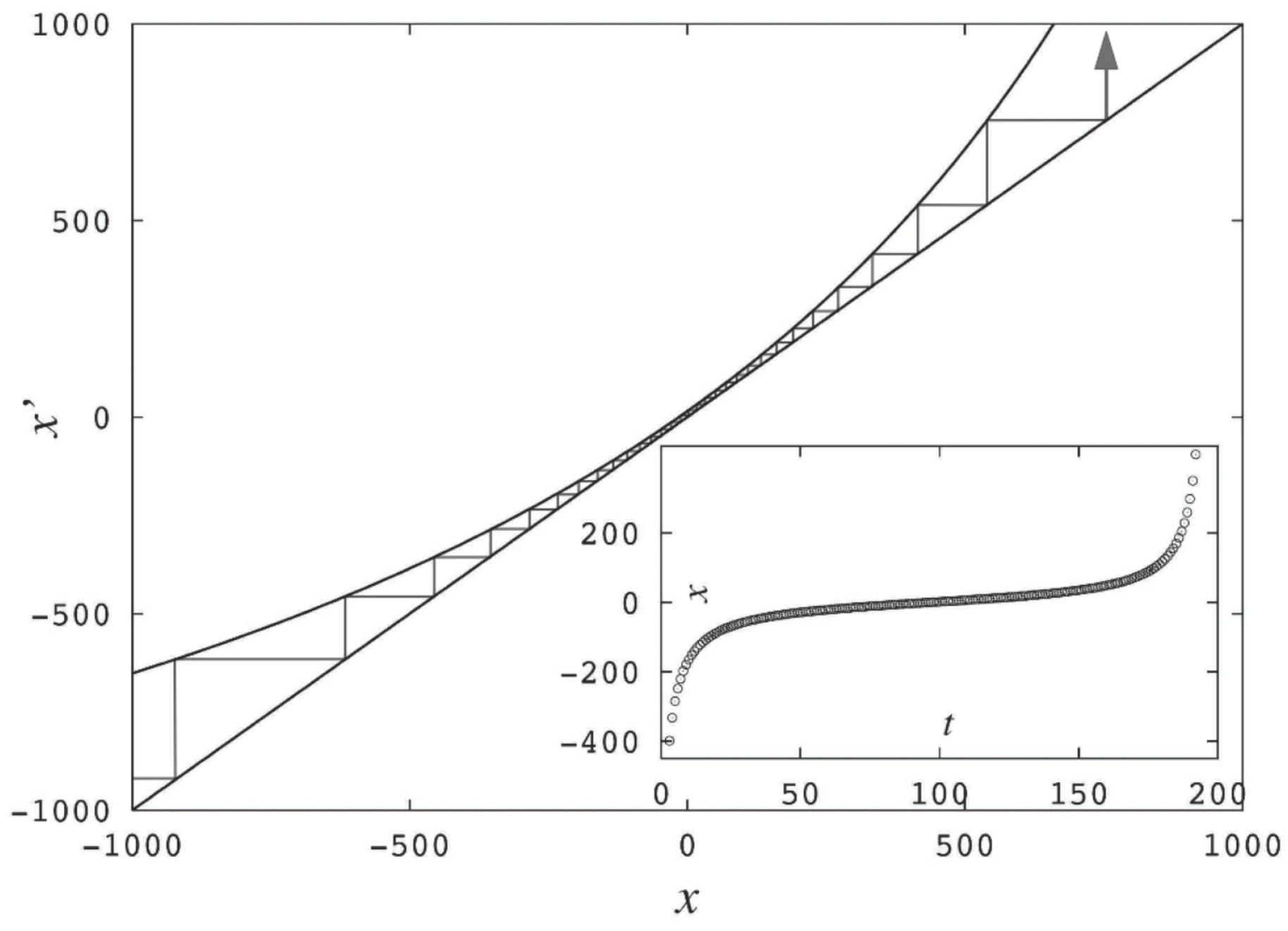 Central to our understanding of the dynamical properties of unimodal maps is the following in-depth property: Time evolution at from up to traces the period-doubling cascade progression from up to . There is an underlying quantitative relationship between the two developments. Specifically, the trajectory inside the Feigenbaum attractor with initial condition , the -supercycle orbit, takes positions , such that the distances between appropriate pairs of them reproduce the diameters, , defined from the supercycle orbits with . See Figure 8, where the absolute value of positions and logarithmic scales are used to illustrate the equivalence. This property has been basic in obtaining rigorous results for the sensitivity to initial conditions for the Feigenbaum attractor [4] and for the dynamics of approach to this attractor [5]. Other families of periodic attractors share most of the properties of supercycles. Below, we consider explicitly the case of a map with a quadratic maximum, but the results are easily extended to general nonlinearity .