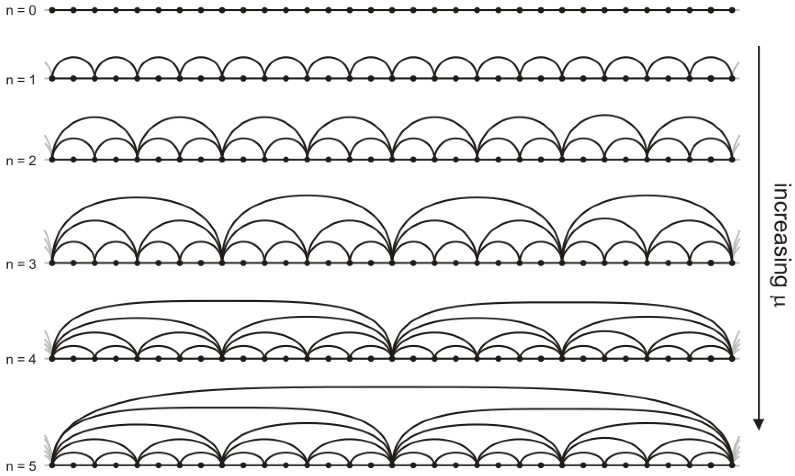 Periodic Feigenbaum graphs for . The sequence of graphs associated with periodic attractors with increasing period undergoing a period-doubling cascade. The pattern that occurs for increasing values of the period is related to the universal ordering with which an orbit visits the points of the attractor. Observe that the hierarchical self-similarity of these graphs requires that the graph for is a subgraph of that for n.
