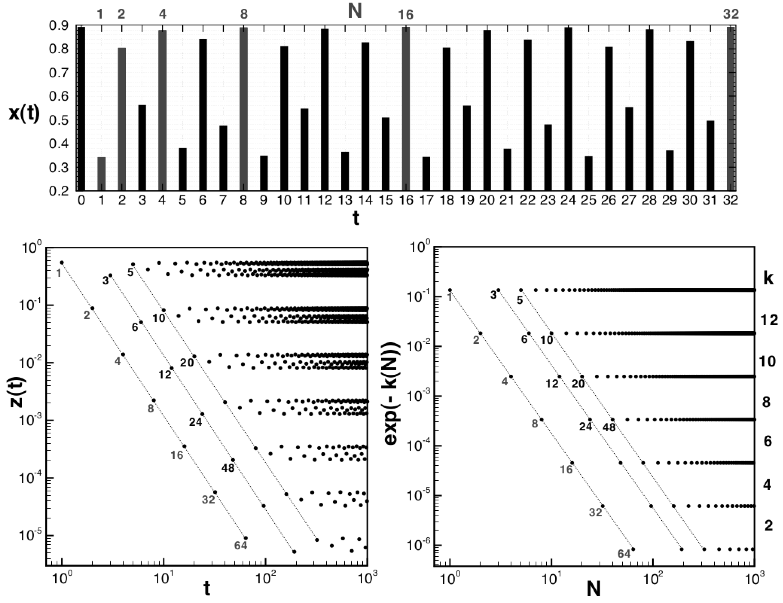 (Top) Series as a function of time t for the first data generated from a logistic map in its version at the period-doubling accumulation point (only the first 33 data are shown). The data highlighted is associated with specific subsequences of nodes. (Left) Log-log plot of the rescaled variable as a function of t, for the same series as the upper panel. This rescaling is performed to reflect the multifractal structure of the attractor. The order of visits to some specific data subsequences is highlighted. (Right) Log-log plot of as a function of the node N of the graph generated from the same time series as for the upper panel, where .