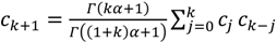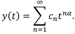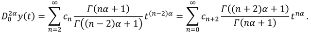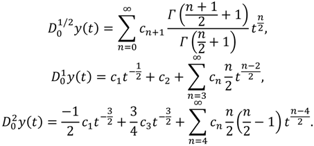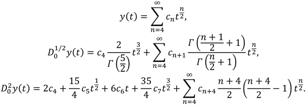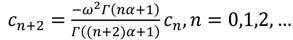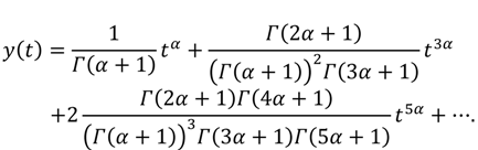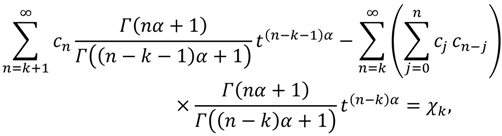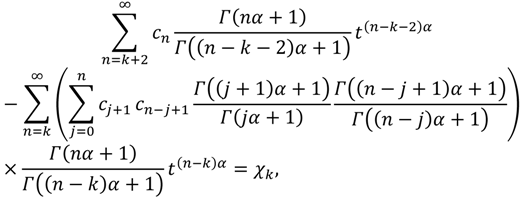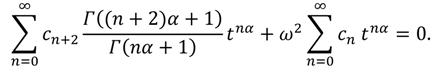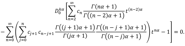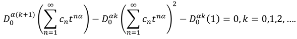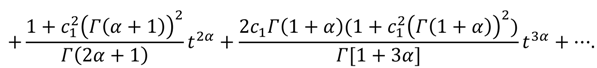 where Xk = 1 if k = 0 and Xk = 0 if k ≥ 1. From Theorems 3.2 and 3.4, the αkth-derivative of the FPS representation, Equation (48), is convergent at least at t = 0, for k = 0,1,2,…. Therefore, the substituting t = 0 into Equation (51) gives the following recurrence relation which determine the values of the coefficients cn of tnα: c0 = 0, , and