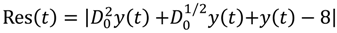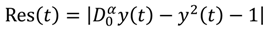 | t | y(t;α = 1.5) | Res(t;α = 1.5) | y(t;α = 2.5) | Res(t;α = 2.5) | ||||