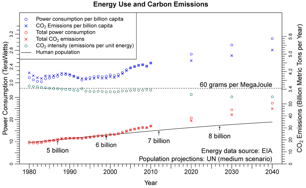 Energy, climate and the environment are the biggest problems of our time. Much of the discussion around these issues focuses on total energy consumption and emissions by the whole world, as well as the corresponding per capita numbers for the whole world population. These trends are shown in Figure 1, where the points for 1980–2010 represent historical data, whereas the points for 2020–2040 are projections by the U.S. Energy Information Administration (EIA). The data source for our paper is [], and spreadsheets for all data plots shown in the paper are available as the supplementary online material. The upward projections in Figure 1 extrapolate the trend observed from 2000–2010. However, limiting global warming to 2 C requires limiting total cumulative carbon emissions to one trillion tonnes [], as stated in the 2013 report by the Intergovernmental Panel on Climate Change (IPCC) []. This is a challenging goal, given that the limit is expected to be reached around 2040 based on current trends [].