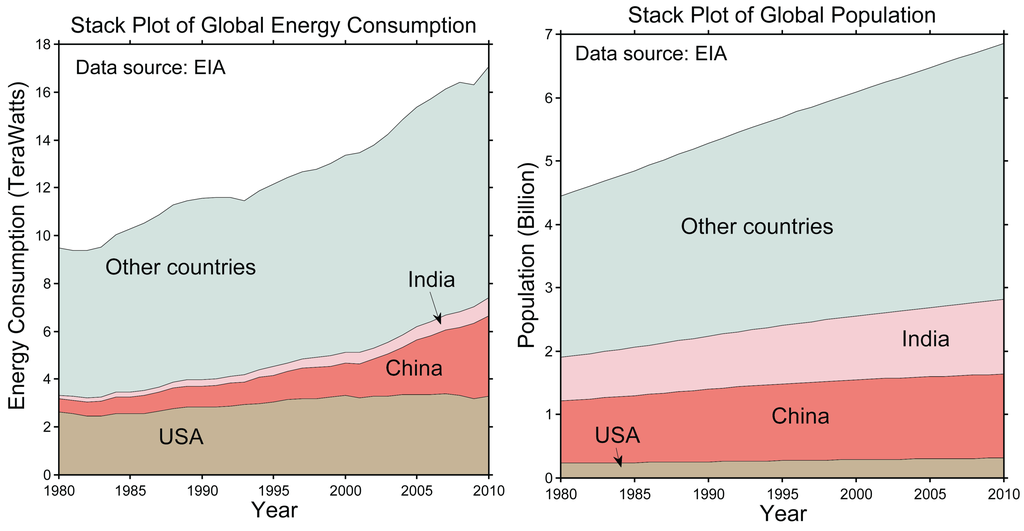 Stack plots of energy consumption (left panel) and population (right panel) the in USA, China, India and the rest of the world from 1980–2010 based on the data from EIA, Energy Information Administration.