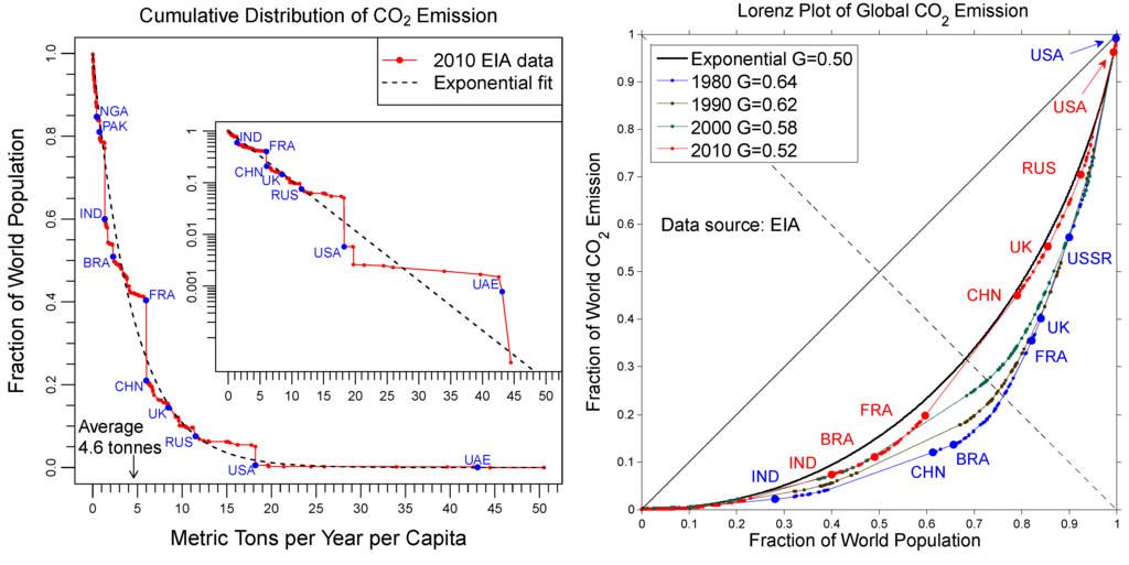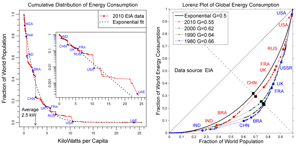 The cost and strategies for climate change mitigation are often discussed in the economic literature using a representative agent model [], where all of the population is reduced to a single “typical” agent. By construction, such approaches ignore the enormous heterogeneity and inequality of the living conditions of the world population. On the other hand, there is also growing recognition that inequality by itself is a serious obstacle for the further progress of human society []. For example, international talks on climate change for the last 20 years failed to produce any result [], in part because the vital economic interests of the countries at the opposite ends of the energy consumption distribution, such as the USA and India, are so different, that it is hard for these countries to agree on substantive policy measures. It may be argued that overcoming global inequality should be a goal in itself [], which would then facilitate global agreements on climate change and other issues. Our paper shows that global inequality in energy consumption and carbon emissions per capita has, indeed, decreased significantly in the last 30 years, presumably due to the globalization of the world economy. However, we also show that global distribution is now close to exponential, as expected from the principle of maximal entropy. Thus, we argue that the global economy will slow down and that global inequality will stay put at approximately the present level, because the global probability distribution of energy resources is already close to maximal entropy. Furthermore, there are arguments in the literature for distinguishing between equality and fairness. An equal distribution in not necessarily fair, and [,] argues that a fair distribution is the one that maximizes entropy. A similar idea was advanced in [,,,,] by arguing that an exponential distribution represents a “natural” inequality, not in the sense that it is fair, but in the sense that it is virtually unavoidable, because it is difficult to fight against entropy maximization.