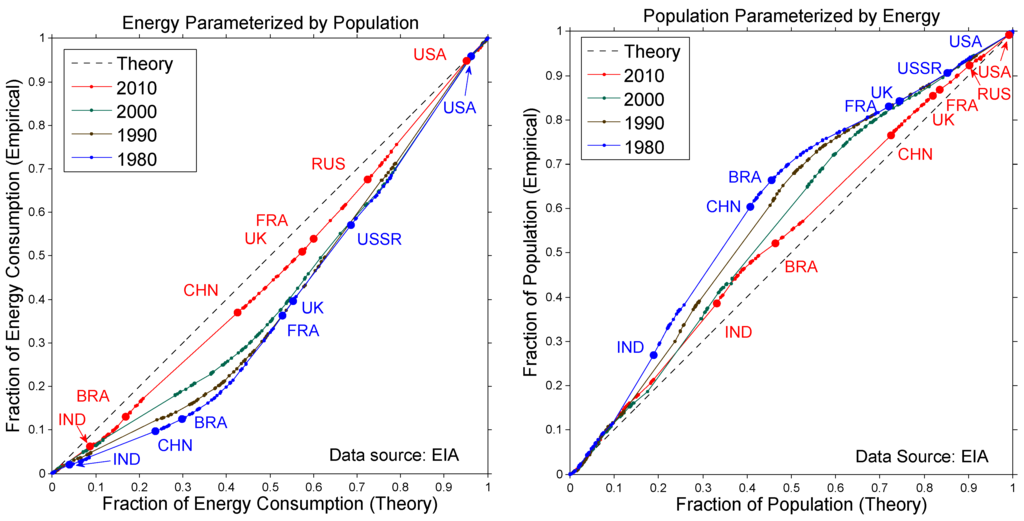 The right panel in Figure 3 shows the parametric Lorenz plots of versus constructed from the EIA data for 1980, 1990, 2000 and 2010. Over this time period, the Lorenz plots have moved up, which indicates that inequality in energy consumption per capita has decreased. However, even the latest Lorenz curve for 2010 is still very far from the straight diagonal line, which would correspond to perfect equality where all countries would have equal .