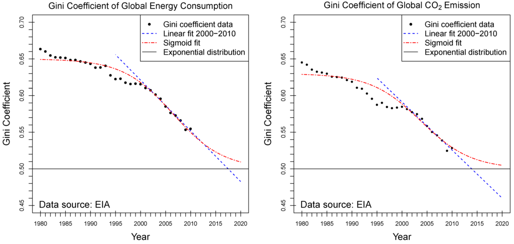 The inset in the right panel of Figure 3 shows that the Gini coefficient for energy consumption per capita has decreased from 0.66 to 0.55 during 1980–2010 and now is close to the theoretical equilibrium value of 0.5. The full historical evolution of the Gini coefficient is shown in the left panel of Figure 5 by the circles, whereas the horizontal line indicates the theoretical equilibrium value for an exponential distribution. We observe that the Gini coefficient was decreasing particularly fast in the last decade of 2000–2010. We attribute this effect to the rapid globalization of the world economy, which brings the world closer to the state of maximal entropy. By making a naive linear extrapolation of the trend for the last 10 years, shown by the blue dashed line in Figure 5, one might expect that the Gini coefficient will reach around 2017 and will continue to decrease toward perfect equality. In contrast, the principle of maximal entropy suggests that the decrease of energy consumption inequality would slow down and saturate at the level corresponding to the exponential distribution. Thus, we make a conjecture that the Gini coefficient will follow a sigmoid curve, shown by the red dashed-dotted line in Figure 5, asymptotically approaching , but not going below this value. We plan to revisit this study in five and ten years from now, when new data will become available, and verify our prediction. Making predictions about the future is always a challenging task. In physics, theories that not only explain known experiments, but also make successful predictions about future observations are particularly valuable. Our conjecture is, in principle, falsifiable, i.e., it may be proven wrong by future observations.