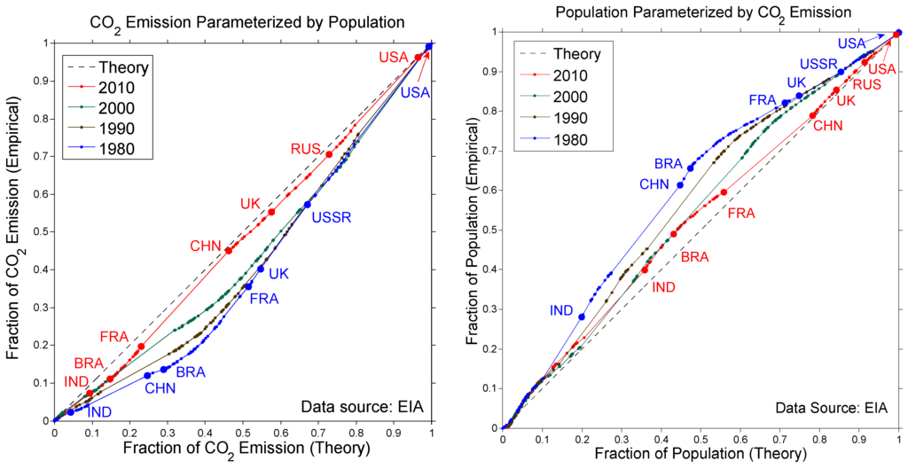Here, we present a study of global inequality in emissions per capita, for which we follow the same procedure as in Section 3, but for carbon emissions instead of energy consumption. The resulting complementary cumulative distribution function for 2010 and the Lorenz curves for 1980–2010 are shown in the left and right panels of Figure 6, respectively. The full time evolution of the Lorenz curves for carbon emissions from 1980 to 2010 is shown in a computer animation movie in the supplementary online material. Again, we observe that the global distribution of carbon emissions per capita is quite close to exponential in 2010. The corresponding parametric plots for carbon emissions are shown in Figure 7 in a manner similar to Figure 4. Interestingly, the global distribution of carbon emissions per capita in 2010 is even closer to exponential compared to the distribution of energy consumption per capita discussed in Section 3. The historical evolution of the Gini coefficient for carbon emissions is shown in the right panel of Figure 5, in comparison with the Gini coefficient for energy consumption shown in the left panel. The plots in the left and right panels look quite similar. Moreover, they are also similar to the plot of the Gini coefficient for global income inequality shown in Figure 1 of [], where it was constructed using Concept 2. The similarity of all three Gini plots indicates that energy consumption, carbon emissions from fossil fuels and monetary income are, essentially, interchangeable measures of global inequality, because each of these measures currently reflects the standards of living around the world.