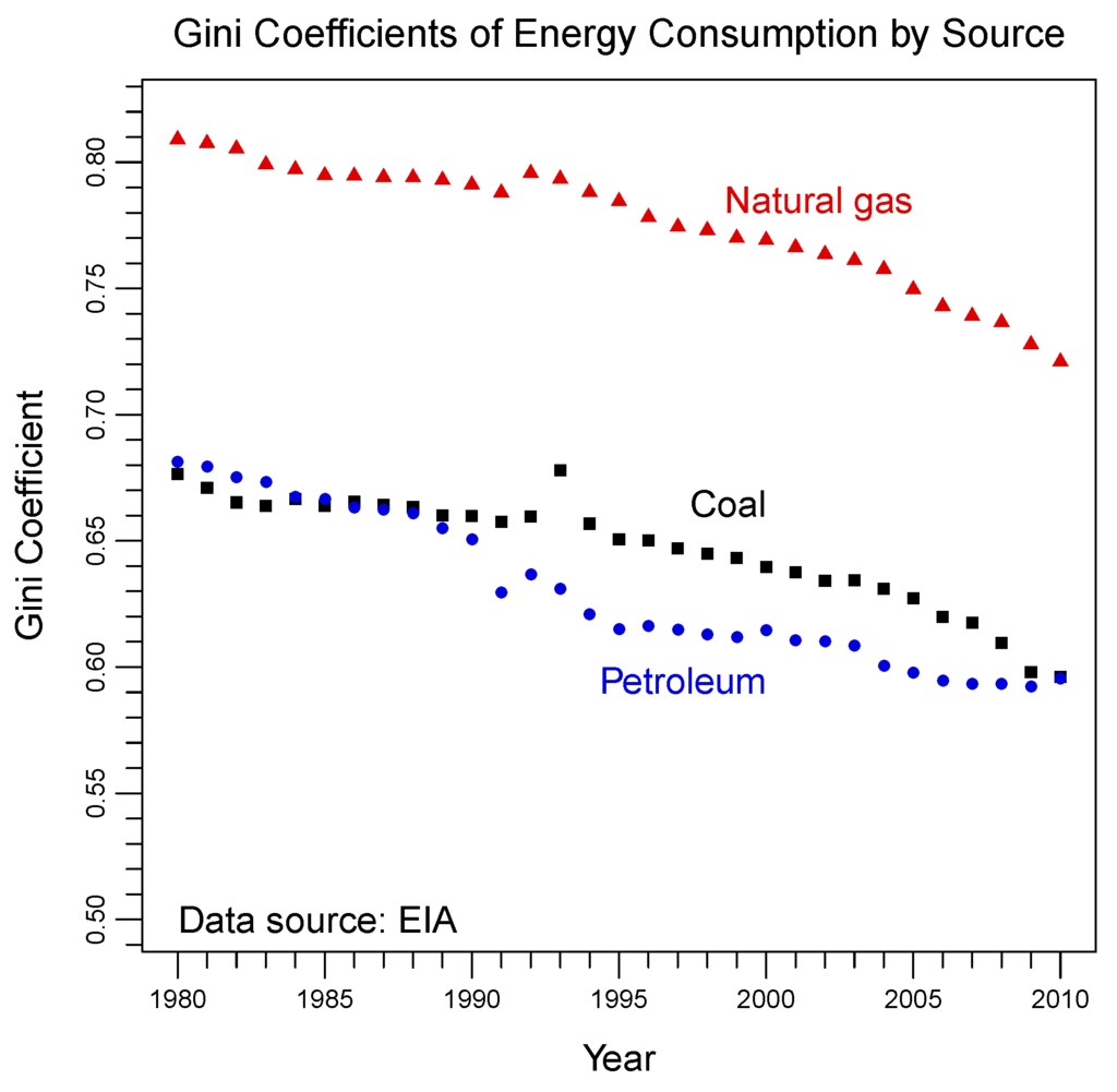 The underlying assumption for the application of the principle of maximal entropy in our paper is that energy resources (typically fossil fuels) are extracted in some places (e.g., in the Persian Gulf) and are redistributed for consumption in different places (e.g., in the USA). Petroleum and coal are relatively easy to transport by sea, but transcontinental transportation of liquified natural gas is more difficult. Thus, we would expect a higher Gini coefficient for the consumption of natural gas per capita compared with coal and petroleum, because natural gas is more difficult to transport on a global scale from the places of its natural abundance. Figure 8 shows that this is indeed the case. While the Gini coefficients for coal and petroleum consumption per capita are relatively close, the Gini coefficient for natural gas consumption per capita is much higher. Nevertheless, all three Gini coefficients decrease in time, with petroleum at the bottom, in qualitative agreement with Figure 5.
