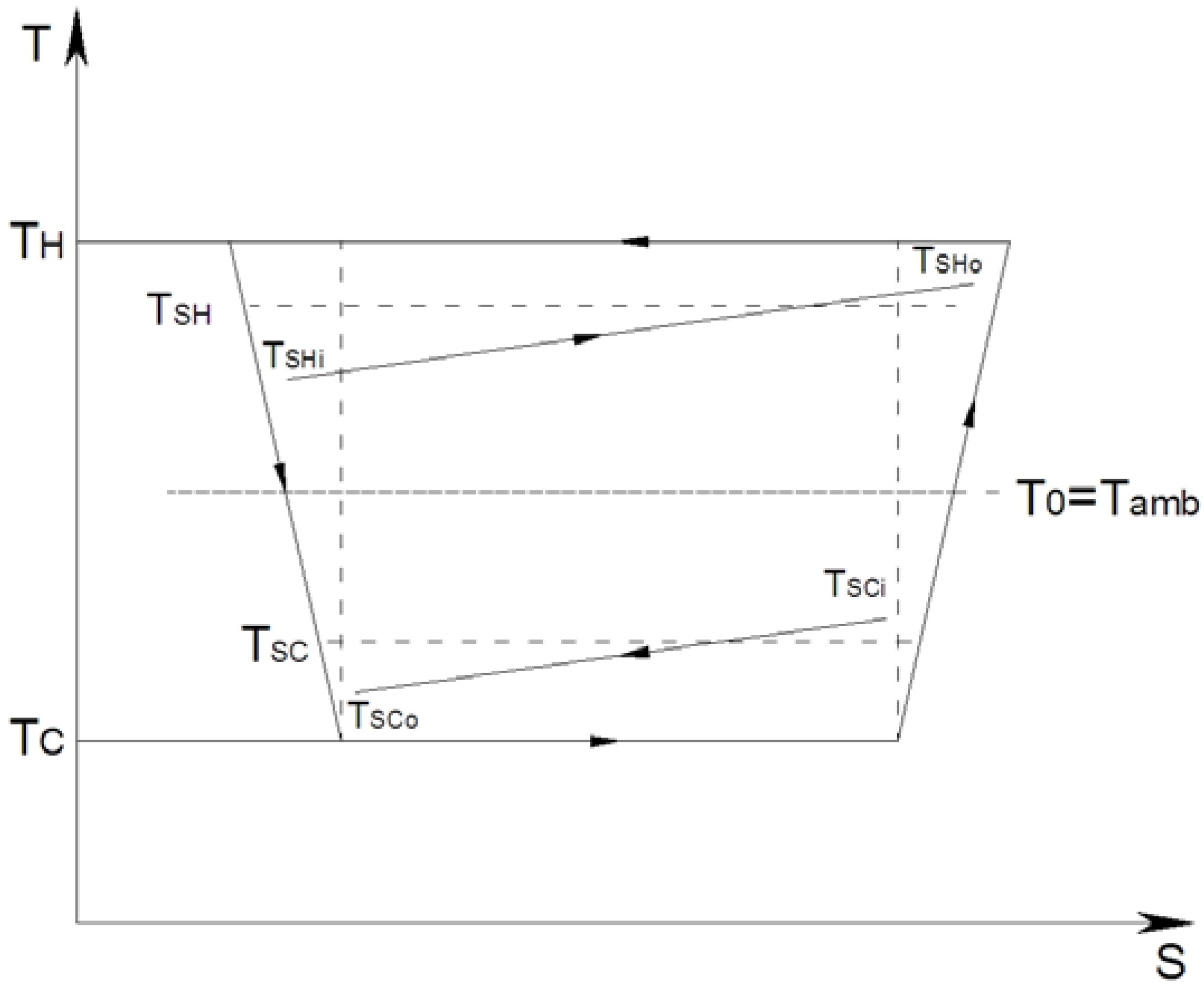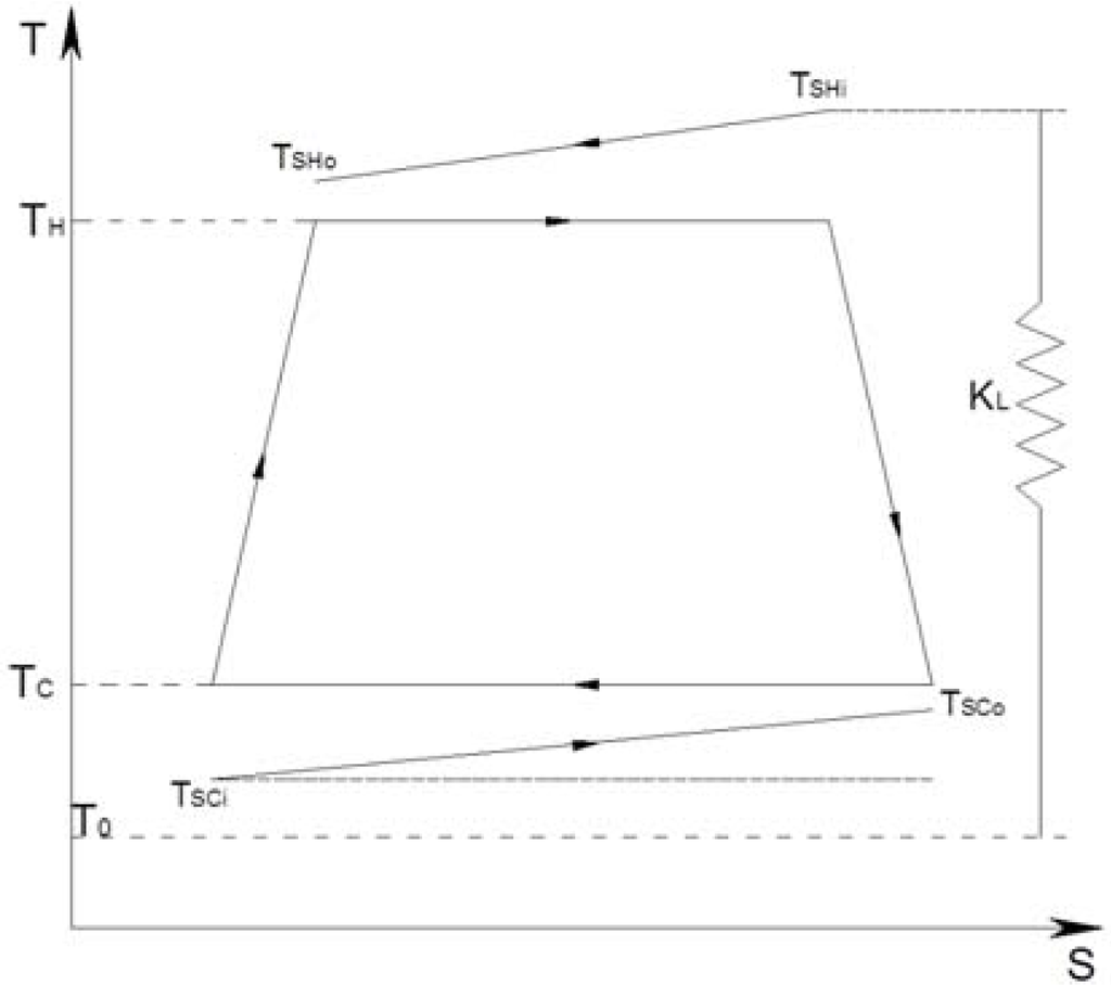 This balance concerns the cycled fluid. is the entropy rate created in the fluid, due to all internal irreversibilities during the cycle. As a first approximation is considered a constant here; More detailed representation of are possible, and detailed in the recent literature [26].