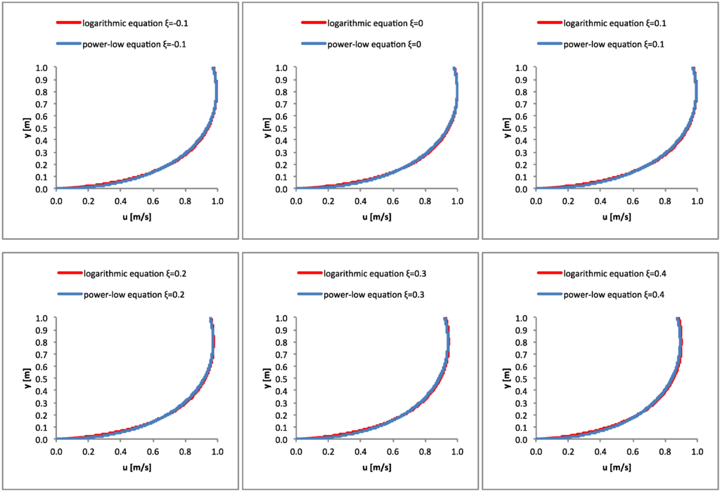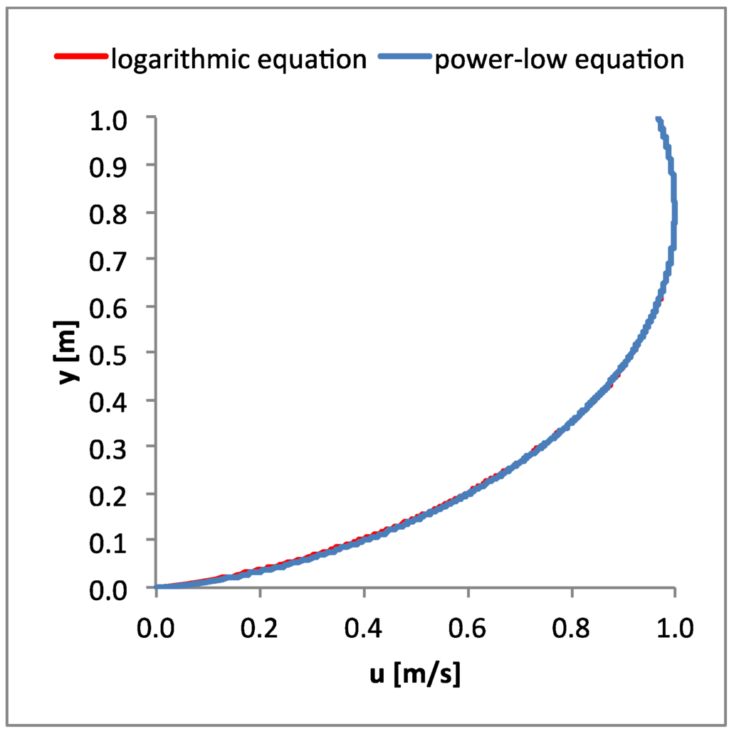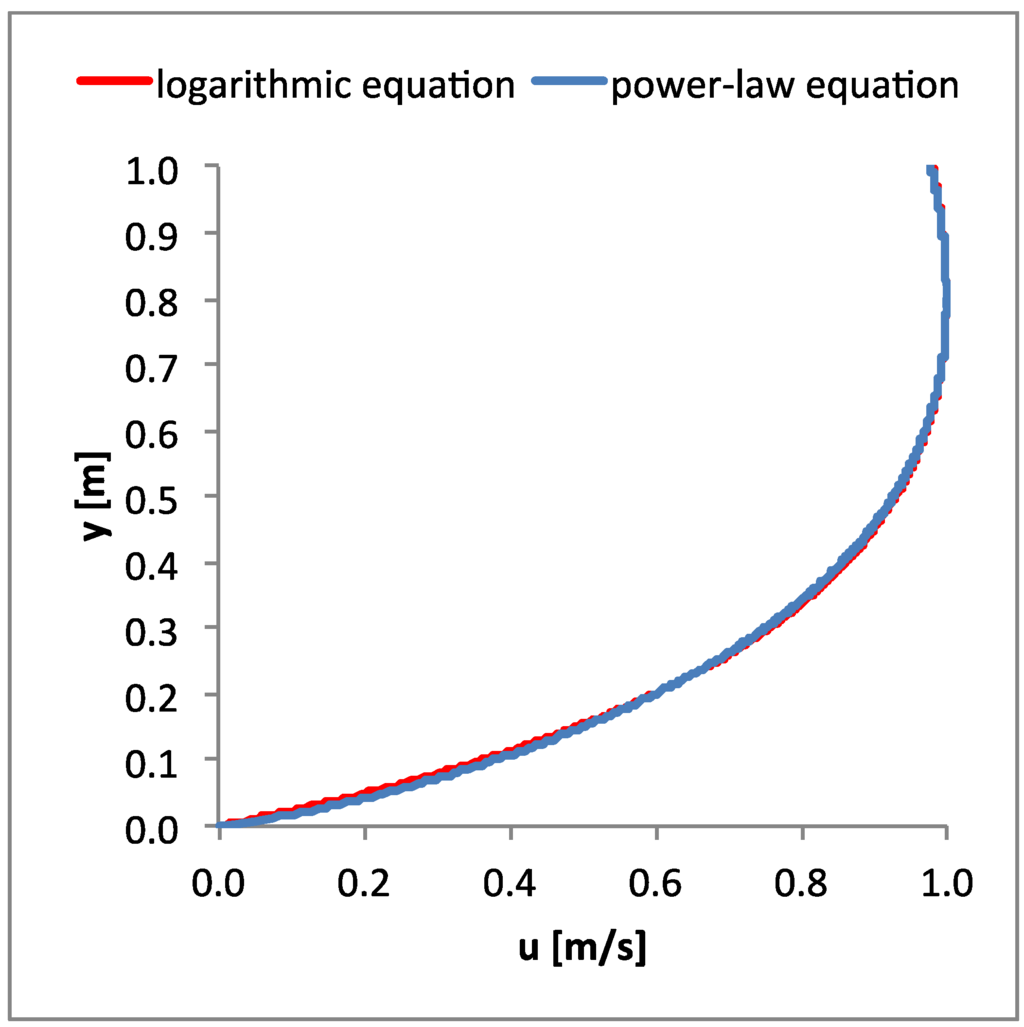 The following data were considered in the example: H = 1 m; umax = 1 m/s; uav = ū = 0.8 m/s, resulting in G = 4.8 from Equation (20) and 1/n = 0.25 from Equation (22). The velocity profiles obtained from the power law velocity distribution [Equation (17)] and the logarithmic velocity distribution [Equation (18)] were almost the same (negligible differences), as shown in Figure 1.