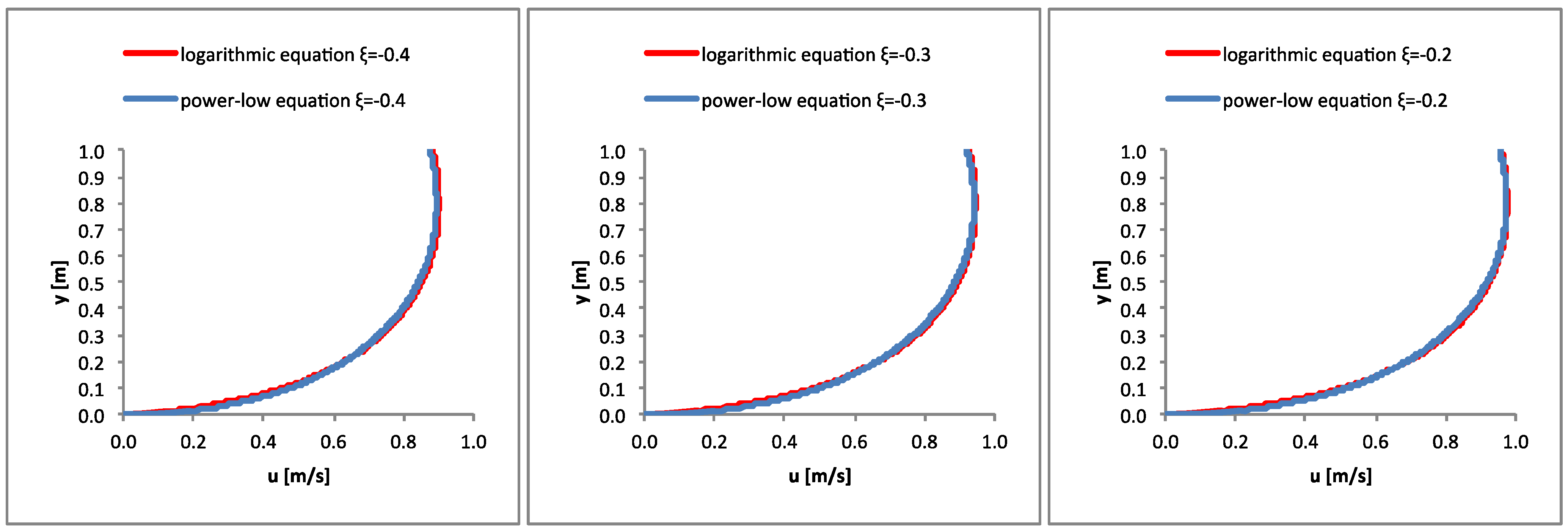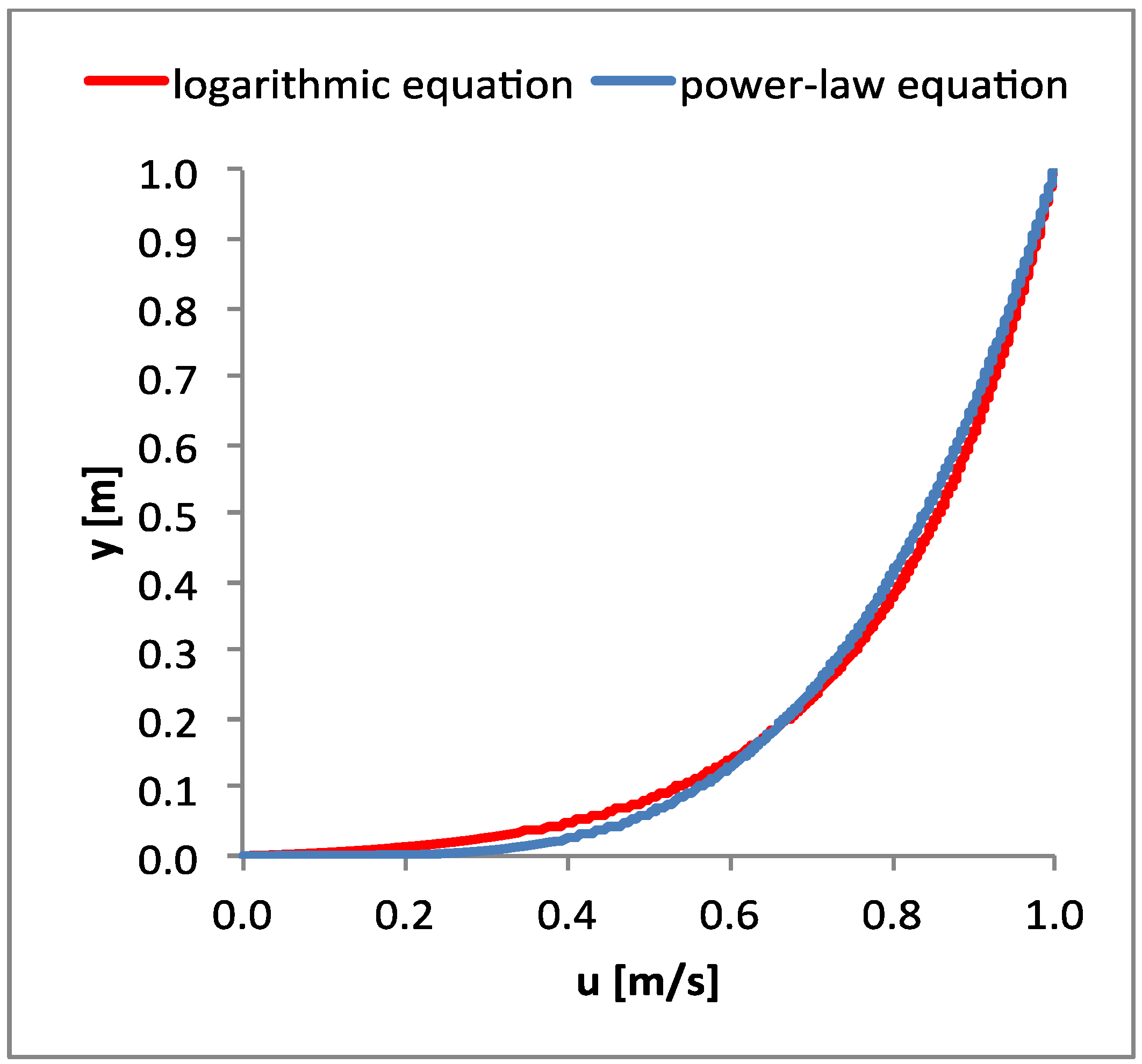 n = 0.25 from Equation (22). The velocity profiles obtained from the power law velocity distribution [Equation (17)] and the logarithmic velocity distribution [Equation (18)] were almost the same (negligible differences), as shown in