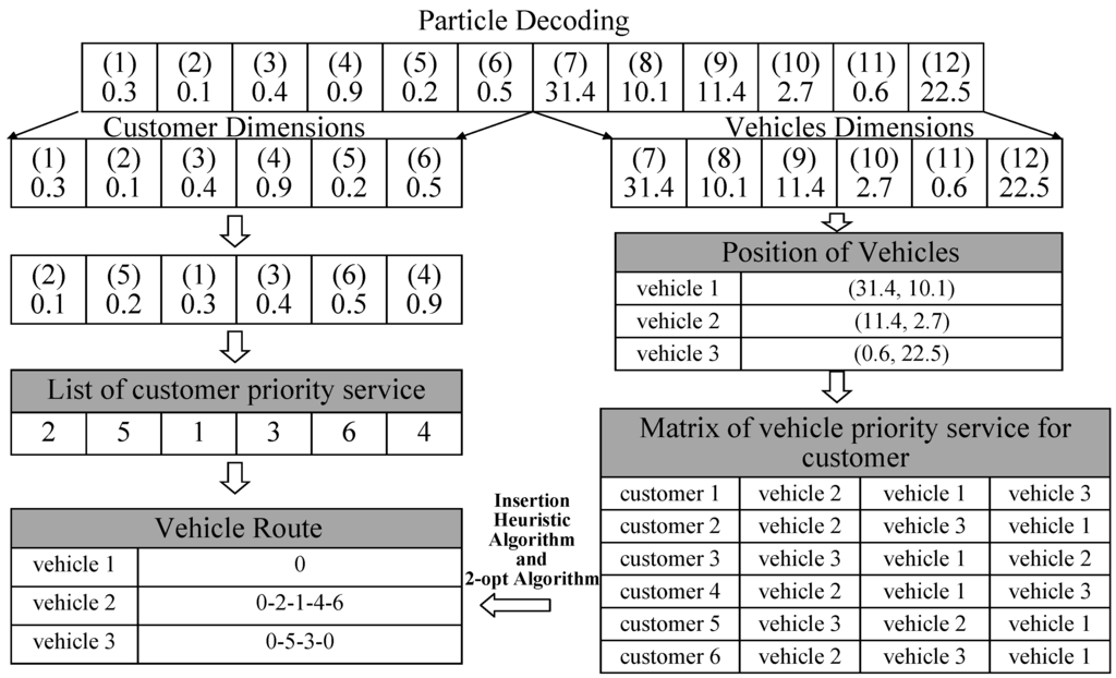 Based on particles encoded, we decode the position of the particles to “the list of customer priority service” and “the matrix of vehicle priority service for the customer”. According to them, we construct the vehicle routes. The process is shown as Figure 1 and described as follows: