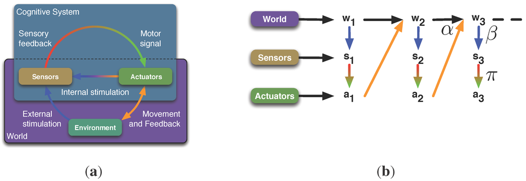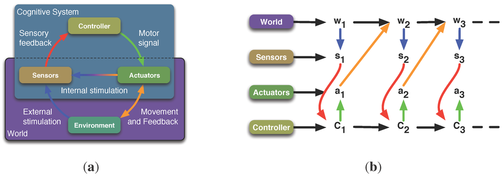 To derive a quantification of morphological computation of an embodied system, it requires a formal model of the sensori-motor loop. This will be briefly summarised in the following paragraph (see also Figure 1(a)). A cognitive system consists of a brain or controller, which sends signals to the system’s actuators. The actuators affect the system’s environment. We prefer the notion of the system’s Umwelt [16,17,18], which is the part of the system’s environment that can be affected by the system, and which itself affects the system. The state of the actuators and the Umwelt are not directly accessible to the cognitive system, but the loop is closed as information about both the Umwelt and the actuators are provided to the controller by the system’s sensors. In addition to this general concept, which is widely used in the embodied artificial intelligence community (see e.g., [19]), we introduce the notion of world to the sensori-motor loop, and by that we mean the system’s morphology and the system’s Umwelt. We can now distinguish between the intrinsic and extrinsic perspective in this context. The world is everything that is extrinsic from the perspective of the cognitive system, whereas the controller, sensor and actuator signals are intrinsic to the system.