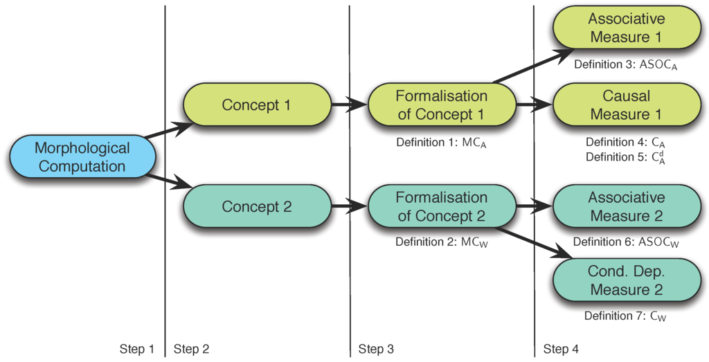 We will derive the measures for morphological computation in four steps (see Figure 2):