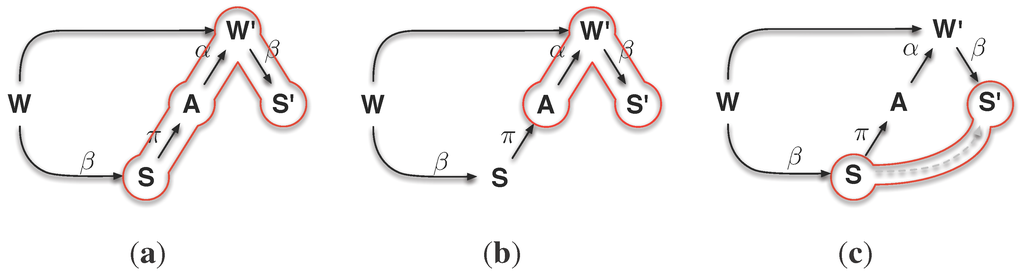 The Kullback–Leibler divergence used in the definition of (see Def. 3) is also known as the transfer entropy of A on S [25] and it was investigated in the context to quantify the informational structure of sensory and motor data of embodied agents [26].Let the random variables denote the action, the current and the next sensor state of an embodied agent, which is described by the causal diagram shown in Figure 1(b). The quantification of the morphological computation as an associative measure of the negative effect of the action is then defined as: