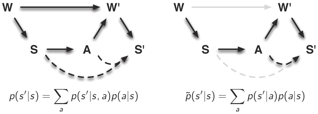 Visualisation of the conditional independence measure . The left-hand side shows how the conditional probability distributions can be calculated from the world model and the policy . The right-hand side shows how changes, if one assumes that the world does not influence itself (gray arrow between W and ), and if this is reflected in the internal world model (gray arrow between S and ). This difference between and is a measure for morphological computation