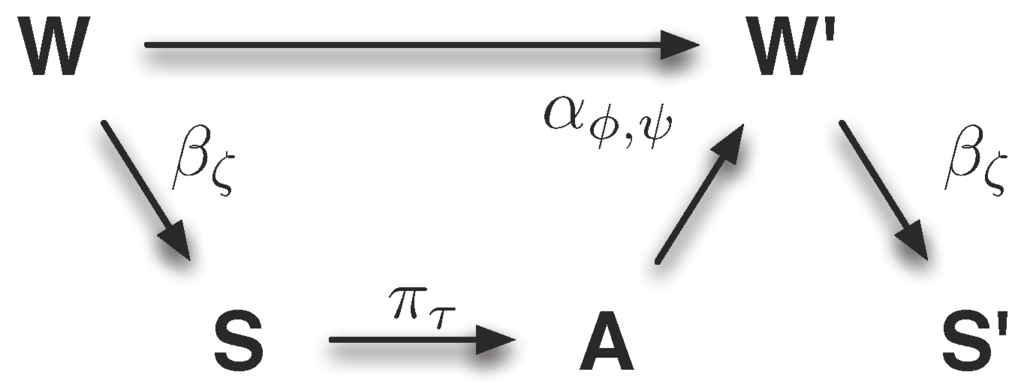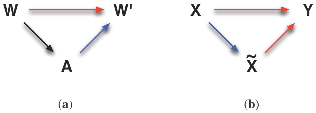 Generally speaking, morphological computation is the effect of the current world state W on the next world state , which is not assignable to the action A. Given the sensori-motor loop as we have defined it above (see Figure 1), this cannot be measured in isolation, as there is a path from W to that goes through the agent. Hence, we need to measure the effect of the action A on the next world state so that we are able to deduce the effect of W on that does not include the pathway over A. This has two implications. First, the resulting value of such a measure is not an absolute value per se. In fact, it can only be measured as the relation of the two effects and . Second, there are two ways of comparing the effects.